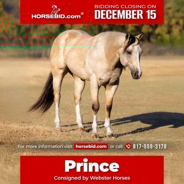 🎄𝐓𝐇𝐄 𝑯𝒐𝒍𝒊𝒅𝒂𝒚 𝐂𝐋𝐀𝐒𝐒𝐈𝐂🎄 Happening now thru MONDAY | DECEMBER 15th - Available EXCLUSIVELY on HorseBid's website! For more details and to register visit: www.Horsebid.com CONSIGNOR CONTACT: Webster Horses 817-559-3178 LOCATION: Decatur, TX BREED: AQHA REGISTERED: Yes REGISTERED NAME: Ucan Call Me Mister COLOR: Buckskin HEIGHT: 15 AGE: 5 GENDER: Gelding Prince is a STUNNING coming 6yo 15hh registered AQHA gelding! You will not find a horse this age as civil as he is. He’s been hauled and seasoned on trails and has been in multiple parades. He has the experience most old horses have at his age. He has years to last as well. He has a correct nice handle on him. Anyone can ride him. Collects and breaks at the poll beautifully at all gates. He has a nice spin/turn around. W/T/C with ease. He will also short lope off. Picks up both his leads great. He is not fast or performance minded. Definitely more woah than go, but not lazy where you have to constantly kick to go. He has a very comfortable and smooth gate. Where he is not performance minded, the best avenue for him if you wanted to do any kind of event would be ranch/trail or obstacle courses. He is so so civil. Leave him off for a month and get right on. He is honest and the same horse every time. He has such a unique look with all 4 high white socks, and his big blaze face, striking dark points on his legs and ears. You could absolutely show him in a halter class as well. He would also be great for anyone just wanting to go down the trail or have a gentle family horse. He will go over/through anything. Just recently ridden through the Vaquero gathering in the down town Fort Worth Stockyards! He’s absolutely healthy in every way, and is super easy to catch and shoe. Stands calm, absolutely no pawing or nickering. He’s perfectly fine to be the only horse you have because he is NOT sour at all. However if you have other horses, he’s good with others too. He loads and unloads easily. This gelding checks all the boxes and would make the best Christmas gift coming up, or get him now that good cool riding weather is here! We will stand behind a 30 day blood test if wanted! Also PPEs are welcome at buyers expense. Please contact Olivia with any questions 817-559-3178. Shipping can be arranged anywhere.