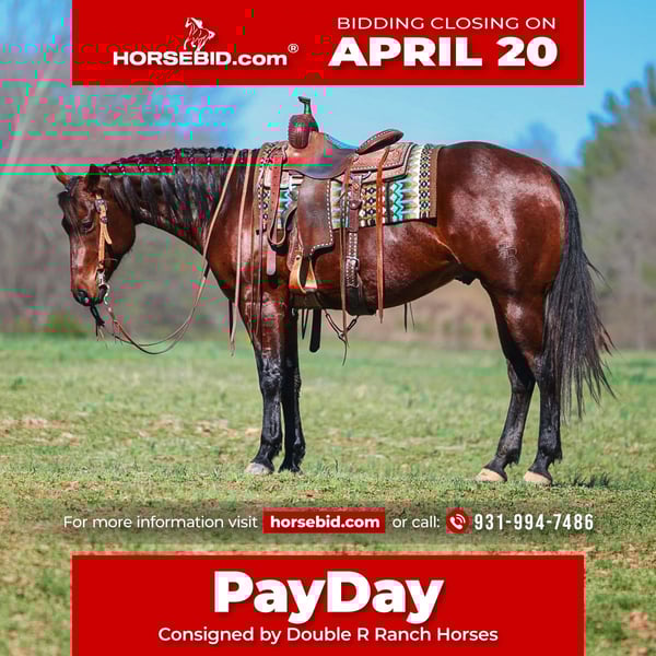 ⚜️𝐭𝐡𝐞 𝓔𝓵𝓲𝓽𝓮 𝐒𝐩𝐫𝐢𝐧𝐠 𝐂𝐥𝐚𝐬𝐬𝐢𝐜⚜️ Happening now thru MONDAY | APRIL 20th - Available EXCLUSIVELY on HorseBid's website! For more details and to register visit: www.Horsebid.com CONSIGNOR CONTACT: Double R Ranch Horses 931-994-7486 LOCATION: Lyles, TN BREED: AQHA REGISTERED: Yes REGISTERED NAME: Gallo Lil Cockamamie COLOR: Bay HEIGHT: 15.2 AGE: 5 GENDER: Gelding Safe. Solid. Absolutely SPECIAL. Meet PayDay. This jaw dropping, blood bay 5 year old AQHA gelding is the complete package. Standing 15.2hh, He’s one of the fanciest geldings you’ll lay your eyes on, with a presence that turns heads everywhere he goes… but what makes him truly exceptional is everything underneath the surface. PayDay has been with us for the last three years. We started him here at our place, and he has been brought along the right way every step of the way. He’s honest, willing, and has proven himself time and time again to have the kind of brain (and build) everyone is searching for. The only reason he is being offered is simply due to his height. He matured taller than we anticipated and outside of my personal preference… otherwise, he wouldn’t be going anywhere. He is by a son of Two Eyed Red Buck and out of a daughter of Gallo Del Cielo (Rooster), giving him a pedigree packed full of proven champions and performance bloodlines. This is the kind of breeding that speaks for itself… and he lives up to every bit of it. PayDay is the first to meet you at the gate, always gentle, kind, and easy to be around. He has that “in your pocket” personality everyone loves, paired with a soft, kind eye and a quiet and sweet nature. He has loads of personality, can be quite the ham at times- and he always keeps us laughing. He will come find you out in the big pasture, in case you might have some attention to give him! He has good ground manners, He stands quietly for grooming, saddling, bathing, the farrier, and the vet. Loves a bath! (He’s kind of a diva.) Under saddle, he is a beautiful mover- soft, and responsive. He rides with a nice handle, moves off your leg, and just naturally carries himself well. Slow spins, big stop and an easy lope. He has been trail ridden extensively. he is sure-footed, level-headed, and confident. Water, hills, wildlife, or new places don’t phase him. You can relax and enjoy the ride. He’s been hauled and exposed to all kinds of settings and scenarios, including downtown in the city traffic, indoor arenas, and out in the country. PayDay has also done some ranch work, including gathering, checking fences and a little pasture roping. He’s been started on the head side as well, and has the ability and mind to go any direction you choose. I also think he would excel in ranch horse classes! He’s versatile, we’ve thrown a lot at him. He’s even been ridden english, really just to see how he would do- and he felt so classy and natural! Popped over some jumps, no problem. He’s so much fun. One of the best things about PayDay, is how he’s up for whatever you want to do, he’s responsive and will move out easily, but he is also slow and chilled out at the same thing. It’s rare to find both types in one horse. His entire life ahead of him- he’s going to make someone everything they’ve ever dreamed of. To put it simply… he’s one of ours. And that says everything. Sound, sane, and ready to take on the world. Or just be your best friend. Recent PPE completed at Todd County Animal clinic- Equine Vet- passed with flying colors! Contact Isaac Vick 931-994-7486 to learn more or schedule a visit to meet PayDay in person.
