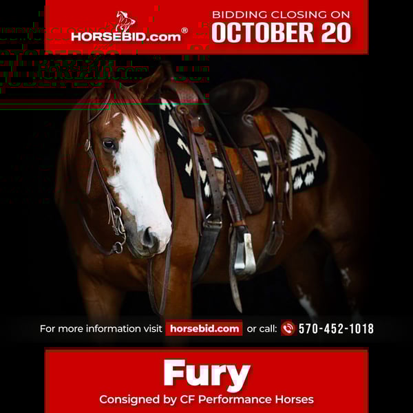 ♦️ 𝐭𝐡𝐞 𝐀𝐌𝐄𝐑𝐈𝐂𝐀𝐍 𝓕𝓪𝓵𝓵 𝓒𝓵𝓪𝓼𝓼𝓲𝓬 ♦️ Happening now thru MONDAY | OCTOBER 20th - Available EXCLUSIVELY on HorseBid's website! For more details and to register visit: www.Horsebid.com CONSIGNOR CONTACT: CF Performance Horses 570-452-1018 LOCATION: Turbotville, Pa BREED: Quarter Horse REGISTERED: No COLOR: Sorrel HEIGHT: 15.3 AGE: 4 GENDER: Gelding Fury is a solid 4 year old grade sorrel gelding with chrome. Standing at 15.3 hands he’s a big dude with a big loving personality. He’s smart, willing to please and SAFE! He’s been used by 4-H kids in showmanship and riding lessons and trail ridden extensively. This guy is a lover not a fighter, he’ll be the first one to walk to you in the pasture and the bottom of the pecking order. He will go all day, any day, doing anything after any amount of time off! Prefers a slow, steady gait but has no problems moving out when asked. Barefoot and sound, no vices and no maintenance needed. In and outside the ring he’s been trailered extensively around Pennsylvania and to Illinois. Has camped overnight at Gettysburg. Cool, calm, confident, and curious could easily be his middle names. He’s ridden with dogs, and is road safe… bikes, trailers, and big rigs are no problem for this guy. Crosses water at any level, goes over logs and anything else you ask him to. Ride Western, English or no saddle at all! Or if you choose no bridle! Goes off of seat, leg and voice commands. He w/t/lopes both directions and can jog a hole in the ground if you ask. He willingly side passes, has a nice stop and back, a solid turnaround, he’s jumped cross rails and logs, had a rope thrown off him and tracked dummies and ducks (for fun). He has no problem dragging logs and anything else you decide to move! He’s worked on solid and rope gates. Has been shown a handful of times at local ranch shows. Can lay down when asked. Loping up a hill and drop your phone? Stop, get off and grab it and get back up and go! Have a wedding coming up? He’s the perfect gentleman to take you down the aisle. He walked me down the aisle as a very green 2 year old dress hanging off his hind like he was the one saying “I DO”. He is great for Farrier, Vet, and bathing. Don’t miss out on this oversized golden retriever, feel free to call and ask about his additional abilities and adventures! (570) 452-1018.