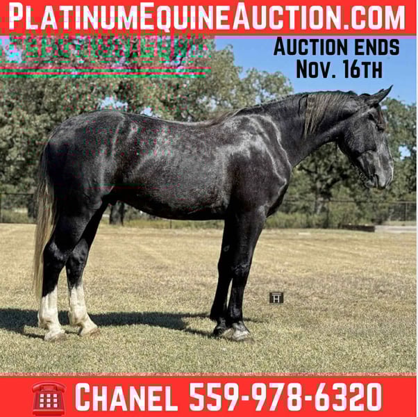 ONLINE AUCTION Place your bids at www.PlatinumEquineAuction.com Starting Bid $3500 Auction ends November 16th, 2025 Need a new saddle? Check out White Rock Saddles on our website or Facebook Slate is one of the most elegant draft crosses we have had the pleasure of offering. Standing at 16.1 hands and a stunning steel gray this coming 4 year old Percheron cross shows a lot of promise to make a top performance type horse. We could easily see him as a fox hunter or even hunter/jumper. He has beautiful movement, and naturally arched neck, collected head set, and lots of expression. Slate is absolutely gentle with no funny business to him. He is sweet and kind and has great ground manners. We have lightly started him over fences and he did not disappoint. His gaits float under both English and Western tack. He is very light and responsive to cues. Slate stands quietly for the mounting block. We have hauled him to the ranch and trail rides and he is excellent outside. He is not spooky and will go anywhere asked of him. He is sure footed and can climb up and down anything. Slate loves the ball and has mastered the art of “kicking” it. Slate is broke to drive both single and double. He is traffic safe and has been ridden and drove down the highways and back roads. Slate is sound in every way. FMI call/text Chanel with Holland Horse Company 559-978-6320. We are happy to answer questions and help arrange shipping! Located in Jacksboro, TX. ONLINE AUCTION Place your bids at www.PlatinumEquineAuction.com Starting Bid $3500 Auction ends November 16th, 2025 Need a new saddle? Check out White Rock Saddles on our website or Facebook