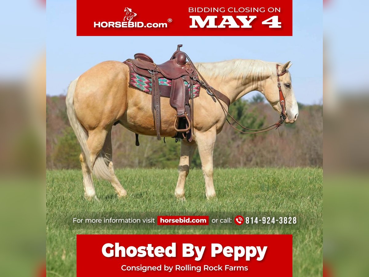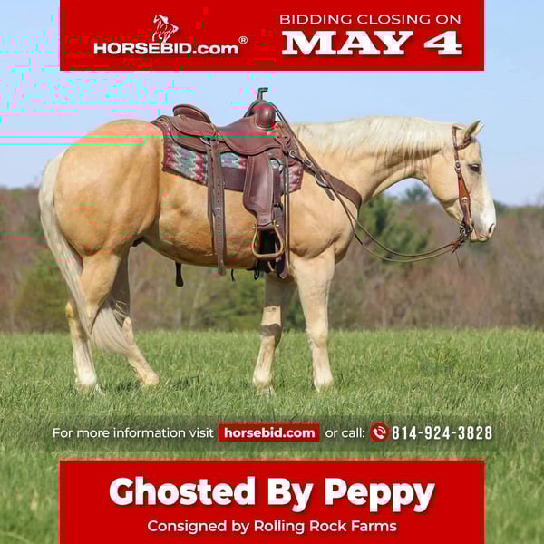 ▪️▫️◾️𝐭𝐡𝐞 𝑴𝒂𝒚 𝐒𝐞𝐥𝐞𝐜𝐭◾️▫️▪️ Happening now thru MONDAY | MAY 4th - Available EXCLUSIVELY on HorseBid's website! For more details and to register visit: www.Horsebid.com CONSIGNOR CONTACT: Rolling Rock Farms 814-924-3828 LOCATION: Miola, PA BREED: Quarter Horse REGISTERED: Yes REGISTERED NAME: GHOSTED BY PEPPY COLOR: Palomino HEIGHT: 15.2 AGE: 5 GENDER: Gelding Ghosted By Peppy, known around here as “Ghost,” is a 5 year old palomino gelding registered with the AQHA. He stands 15.2 hands tall and is a very broke, well rounded gelding that is ready to go on and excel in just about any direction you choose. He combines a great mind, strong foundation, and eye catching looks that make him stand out both in the arena and outside. Ghost is very solid in the arena with a true neck rein and a correct pivot. He rides around very responsive to your seat and legs. He will walk, trot, and lope on a loose rein and is just as willing to pick up a headset when asked. He has a good stop, backs up correctly, and stays soft in the bridle. He is the kind of horse that is enjoyable to ride whether you are asking him to work or just taking it easy. Outside, Ghost is just as dependable as he is in the arena. He is confident riding out alone and handles water, brush, and different terrain without issue. He has been used around gates and will open and shut them with ease, and he will carry a flag quietly. He is athletic and sure footed, making him a great option for ranch riding, endurance trail riding, or as a performance prospect. On the ground, Ghost has good manners. He stands tied to be tacked, brushed, and bathed and is easy to bridle. He is good about picking up all four feet and is easy to catch whether he is in a stall or out in the pasture. He is gentle to be around and has a willing attitude that makes him easy to handle in everyday situations. Ghost is an extremely good looking gelding with the kind of presence that gets noticed wherever he goes. He has the mind, training, and ability to make a very nice horse for someone looking for a dependable partner that can do a little bit of everything.