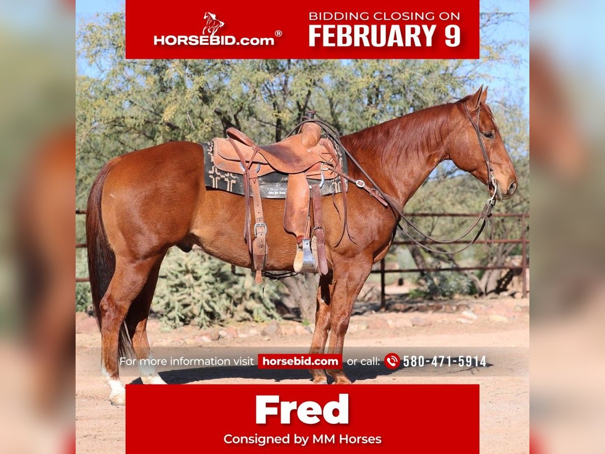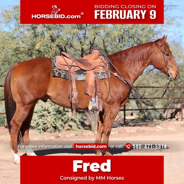 ❤️🔥𝑩𝒆 𝑴𝒊𝒏𝒆 𝐒𝐄𝐋𝐄𝐂𝐓❤️🔥 Happening now thru MONDAY | FEBRUARY 9th - Available EXCLUSIVELY on HorseBid's website! For more details and to register visit: www.Horsebid.com CONSIGNOR CONTACT: MM Horses 580-471-5914 LOCATION: Cave Creek, AZ BREED: Aqha REGISTERED: Yes REGISTERED NAME: Dessert Rat COLOR: Sorrel HEIGHT: 14.3 AGE: 5 GENDER: Gelding Fred is 14.3 stout made and fancy broke. He has been used extensively on the ranch, feed yards and, wheat pastures. He has also been to town to the shows. He is good in the ranch/feedlot sorting events and would also be a good horse for the boxing event. Fred is also very good to rope on in the pasture and the ranch rodeos he has had a few roped out of the box in the team roping and is taking to it like a duck to water. Fred is one handed broke and user friendly you do NOT have to be an advanced rider to get along with Fred as he is very gentle and forgiving.Fred is also great on the trails and has been ridden through the mountains and various other places that are rough terrain.. He crosses water with ease will stand tie all day and not move. He is good to clip, bathe,haul, etc. he sells sound with no vices