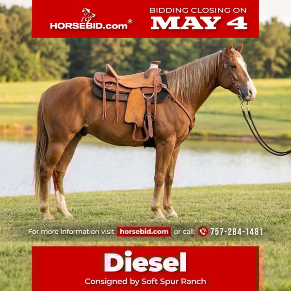 ▪️▫️◾️𝐭𝐡𝐞 𝑴𝒂𝒚 𝐒𝐞𝐥𝐞𝐜𝐭◾️▫️▪️ Happening now thru MONDAY | MAY 4th - Available EXCLUSIVELY on HorseBid's website! For more details and to register visit: www.Horsebid.com CONSIGNOR CONTACT: Soft Spur Ranch 757-284-1481 LOCATION: Dinwiddie, VA BREED: Quarter Horse REGISTERED: No REGISTERED NAME: Diesel COLOR: Chestnut HEIGHT: 16.1 AGE: 5 GENDER: Gelding SSR Blowing Smoke aka Diesel is a 5 year old 16.1hh quarter horse gelding with the athletic ability to continue in any direction. Diesel has successfully jumped courses and has started learning basic lead changes. He has competed at local hunter shows and has gone cross country schooling off property. Diesel also loves to trail ride and will proudly lead the pack or follow behind at your desired pace. He has three very flashy gaits that make him desirable in the show ring. He has quietly toted a junior rider around without any hesitations. He has crossed bridges, roads, and water confidently. He is very sweet on the ground and has no vices. He loads, ties, and clips. He is good for both vet and farrier. He is barefoot and sure footed. Although he is young he is an amazing brain with a great personality to match. If you are looking for a show mount or just a fun trail horse, Diesel is your boy!