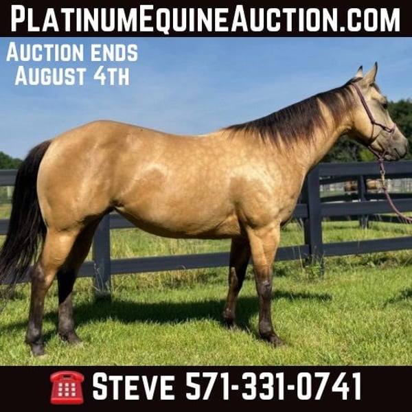 ONLINE AUCTION Place your bids at www.PlatinumEquineAuction.com Starting Bid $3500 Auction ends August 4th, 2024 Need a new saddle? Check out White Rock Saddles on our website or Facebook! Scotch Gun Dunnit “Scotch” is 2020 Model, Registered AQHA, Buckskin Mare, standing 14H. Her pedigree is an all-star line-up of horses, going back to Colonels Smoking Gun, Gallo Del Cielo(AKA Rooster), High Brow Cat, Catster and Pale Face Dunnit! She is a naturally athletic western performance horse and has been shown at Foundation Quarter Shows in ranch pleasure, ranch riding, ranch trail, and reining. Scotch is a talented stopper and has a great turnaround. She also loves hitting the trail and maneuvering through the terrain. She has the temperament of a great all around horse. She’s playful and eager yet easy going. Located in Brooklyn, WI. Contact Steve Andrews 571-331-0741 for more info. ONLINE AUCTION Place your bids at www.PlatinumEquineAuction.com Starting Bid $3500 Auction ends August 4th, 2024 Need a new saddle? Check out White Rock Saddles on our website or Facebook!