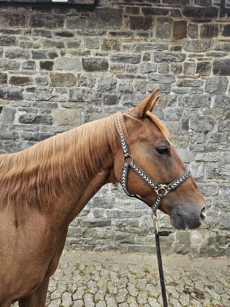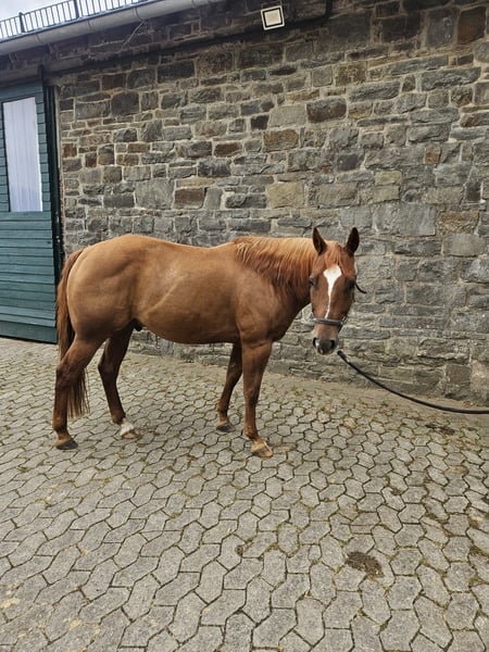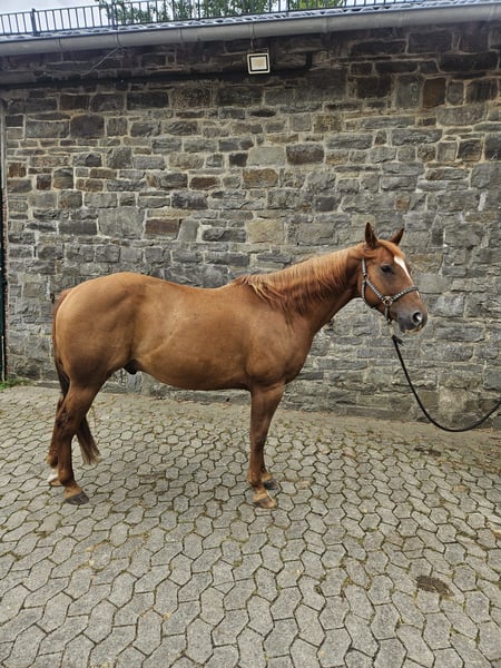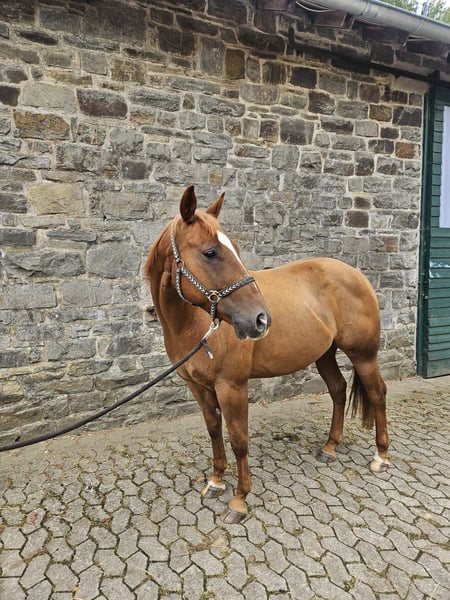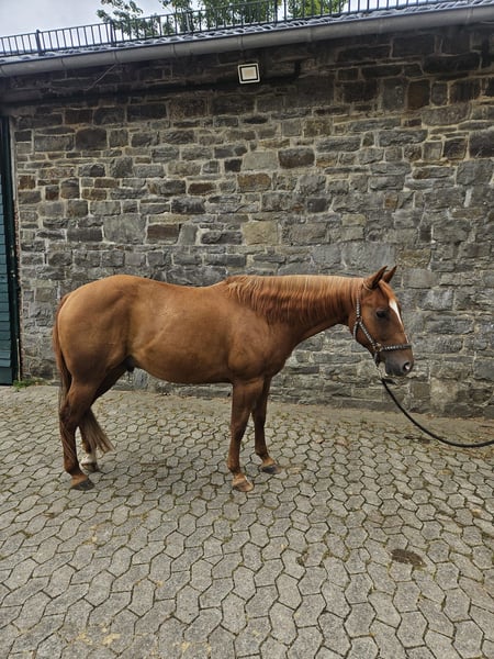 **Sales Advertisement: American Quarter Horse Gelding** On behalf of the owner, we present a beautiful American Quarter Horse gelding, born in 2019. He has a striking chestnut coat and a height of approximately 146 cm, making him an ideal leisure partner. This charming gelding impresses with his friendly nature and always aims to please. He is excellent for various recreational activities, whether it be lessons, long rides, or groundwork. He also enjoys trail obstacles. He has a solid basic training, which opens many doors for further education. Oak is always willing to learn and cooperative. If you are interested or have any further questions, please feel free to contact me. Visit us and get to know this wonderful gelding in person!