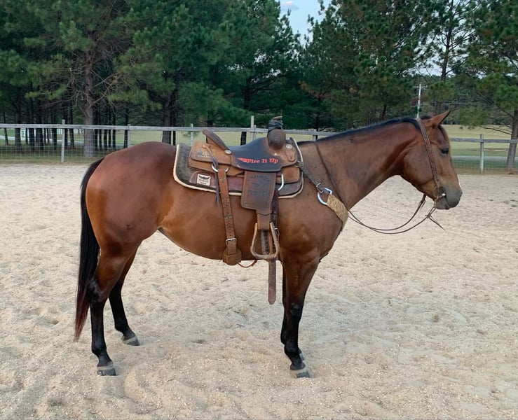 ONLINE AUCTION Place your bids at www.PlatinumEquineAuction.com Starting Bid $3500 Auction ends December 22nd, 2024 Need a new saddle? Check out White Rock Saddles on our website or Facebook! Sweet Rattletrap (Nemo) is a coming 4 yr old mare that stands 14.3 and is an OWN Daughter to Reserve World Champion Two ID Sweet Buck. Hands down you won’t find a prettier filly who has that dark bay color throughout the winter months. She gets looks and compliments everywhere we go! Nemo stands tied, stands to saddle, loads, bathes, can clip with ease, and stands for farrier. Nemo’s pedigree has Pitzer Ranch breeding and is Pitzer Invitational Eligible! She has been exposed to cattle, hauled to ride in arenas as well as outdoors. She has been ridden in pastures and trails including up and down hills. She has been exposed to 4 wheelers, mowers, tractor, cattle, and the roping sled. Nemo is friendly and will come to you when you open the gate or stall door. Her sire (Two ID Sweet Buck) has 68.5 AQHA Points, AQHA Reserve Versatility Ranch Horse Cowboy World Champion, AQHA World Show Qualifier in Jr. heeling and ranch riding. Nemo is a pleasure to be around and is ready to take you in any direction. For more info contact Trent Barnett 662-927-0796 Located in Calhoun City, MS. ONLINE AUCTION Place your bids at www.PlatinumEquineAuction.com Starting Bid $3500 Auction ends December 22nd, 2024 Need a new saddle? Check out White Rock Saddles on our website or Facebook!