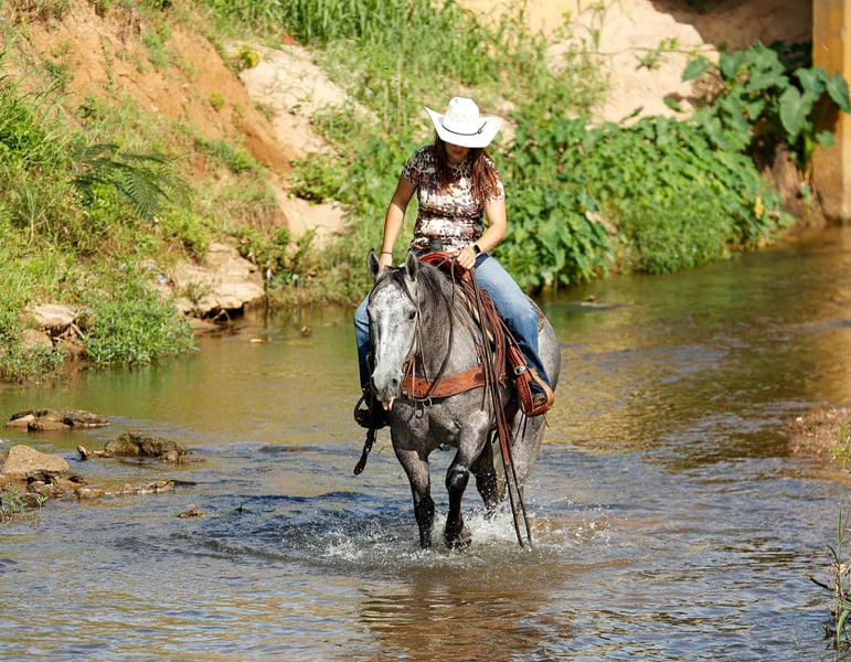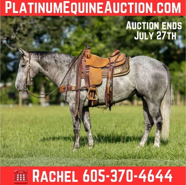 NLINE AUCTION Place your bids at www.PlatinumEquineAuction.com Starting Bid $3500 Auction ends July 27th 2025 Need a new saddle? Check out White Rock Saddles on our website or Facebook LIL KEMO SAHBEE AKA Kemo is a 5 AQHA gray gelding, standing 14.3 hands and stout! Kemo is a tried and true all around gelding! From the arena to the trails, and the ranch, this guy has done and seen it all! Travels out confidently by himself or with other horses. He is remarkably surefooted, you can count on him to pay attention and navigate any terrain you put in front of him. He will go absolutely anywhere you point your reins! He loves water, crosses all type of obstacles and terrain, and has been exposed to all types of wild life, livestock, and machinery! Kemo is great in all types of trail group settings, and will lead the pack or follow! If you enjoy the weekend show life, or love riding in the arena, you can also count on Kemo to be your partner! You’ll love taking him for a spin in the arena! Kemo is a naturally good mover, he carries himself well, has a good stop, easy back up, side passes to open/close gates. His neck rein is solid & true, stays right between your bridle reins. Kemo has also been rode lightly in English and would excel in that direction as well! He would also make a great western dressage partner and has all the buttons to be competitive in the working equitation! He is equipped with the skills and demeanor to excel in a wide array of disciplines. We’ve turned back cattle on him, have ridden him all over the pastures checking yearlings and cow/calf pairs. Kemo is always the pick for Ranch Rodeos as well. Whether you’re eyeing the show pen or seeking a versatile partner to hit the trail with Kemo is the man for you. He has a supple stop, collects on the bridle, side passes, spins, and more! You can do all of the ranch trail maneuvers on him with ease and it does not take an experienced rider, special equipment, or a tons of training to be able to understand and utilize all of his buttons. Kemo is very affectionate and is the first to meet you at the gate, and is guaranteed to become a lifetime member of your family! If you would like to schedule a time to come meet and ride Kemo, or have any other questions Kemo feel free to reach out! Rachel TR Livestock with or to make a Buy It Now Offer, 605-370-4644. Located in Rusk, TX. ONLINE AUCTION Place your bids at www.PlatinumEquineAuction.com Starting Bid $3500 Auction ends July 27th 2025 Need a new saddle? Check out White Rock Saddles on our website or Facebook