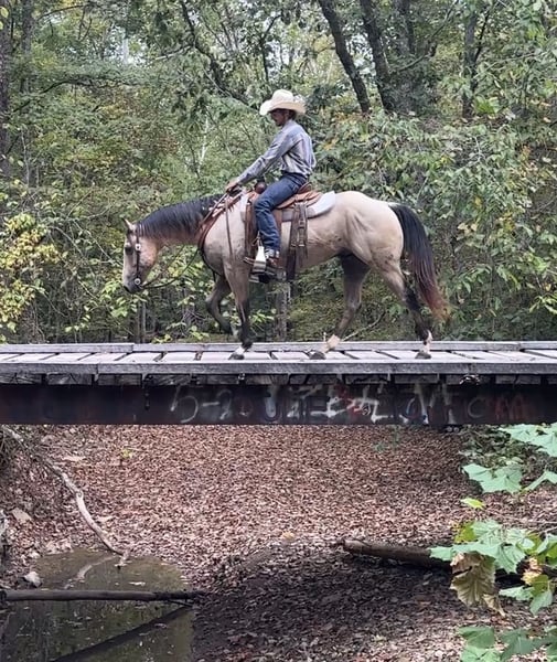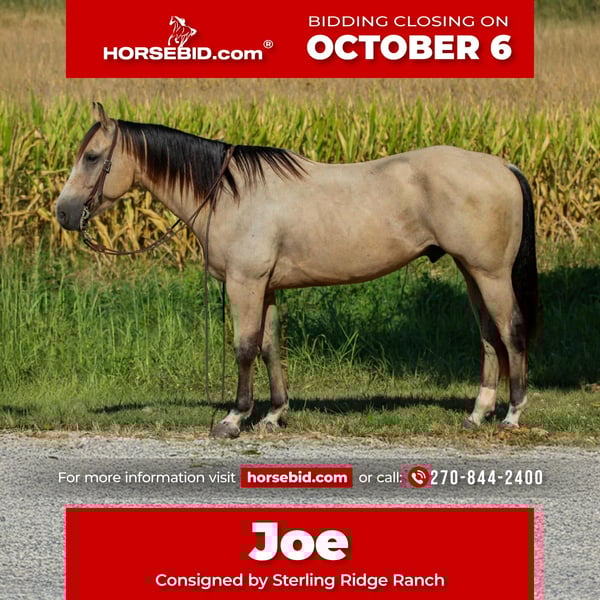 🍂 𝓐𝓾𝓽𝓾𝓶𝓷 𝑨𝑳𝑳 𝑺𝑻𝑨𝑹 𝑳𝑰𝑵𝑬𝑼𝑷 🍂 Happening now thru MONDAY | OCTOBER 6th - Available EXCLUSIVELY on HorseBid's website! For more details and to register visit: www.Horsebid.com CONSIGNOR CONTACT: Sterling Ridge Ranch 270-844-2400 LOCATION: Henderson KY BREED: Quarter Horse REGISTERED: Yes REGISTERED NAME: Wauritas Joe Buck COLOR: Buckskin HEIGHT: 14.3 AGE: 5 GENDER: Gelding Joe stands about 14.3 hands tall. He has been extensively trail rode by a 69 yr old gentleman for the past 3 years. He rode him in parades as well as pushed cows around on his farm. Joe is the family-safe trail horse everyone is looking for. If you can sit in the saddle and hold the reins you can ride Joe. He is a point and go type of horse. He has been hauled and trail ridden extensively through many different types of terrain. He is sure footed and honest. Joe is not spooky and will cross creeks, go through any body type of water, thick brush, logs, bridges, rough terrain and up and down cliffs with ease. He has been rode on the road and is use to all kinds of traffic, heavy machinery and ATV’s. He is also dog safe. You can ride Joe out alone with ease or with other horses. He will make a great horse for any level of rider. He is a sweet and well mannered gelding. Joe has a good neck rein on him, good stop, W/T/C, and has a nice lope, hauls good, bathes good, stands good for farrier and to be saddled and mounted. Suitable for any level rider. Great on picket line and over night camping. He stands quiet with no nonsense. He is easy to catch and loves attention. We invite anyone and everyone to come meet and ride Joe at our barn in Henderson, Kentucky. We work with several shippers and are gladly to assist with transportation arrangements. PPE at buyers expense are welcomed. Contact Tasha (Agent) at 270-844-2400 for any and all questions.