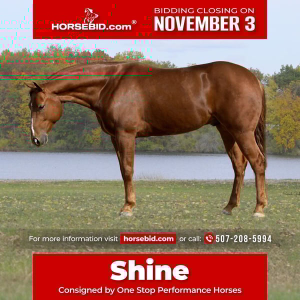 ⚜️𝐓𝐇𝐄 𝐅𝐀𝐋𝐋 𝐇𝐄𝐑𝐈𝐓𝐀𝐆𝐄 𝐂𝐋𝐀𝐒𝐒𝐈𝐂⚜️ Happening now thru MONDAY | NOVEMBER 3rd - Available EXCLUSIVELY on HorseBid's website! For more details and to register visit: www.Horsebid.com CONSIGNOR CONTACT: One Stop Performance Horses 507-208-5994 LOCATION: Oelwein, IA BREED: AQHA REGISTERED: Yes REGISTERED NAME: Mr Melody Shines *by Shine Chic Shine* COLOR: Sorrel HEIGHT: 14.3 AGE: 5 GENDER: Gelding Shine is a 5yr old own son of Shine Chic Shine and out of a daughter of Mr Melody Jac that stands 14.2hh and boasts the conformation of an athlete bred to be as great as his papers suggest. Shine has had a consistent 3 years of professional reining training and is solid in all the maneuvers. His solid training makes him an easy auto pilot ride and his mind and gentle demeanor make him very novice and youth safe. He is a natural big stopper, has a great turnaround, solid lead change, and is a push button ride. Besides all of his reining training, Shine has also been out on the trails and really enjoys his time out. He will cross creeks, ride right down the road, and is happy to go out alone or with others. He is also great at all arena obstacles including ground poles, bridges, the teeter-totter bridge, and is great with the tarp, dragging logs or the tire, and will carry the flag. This gelding is gentle every day, whether laid off for a week or months at a time. Which has made Shine a barn favorite and enjoyed by everyone who meets him, including a 12yr old boy. Shine is easy to care for and has required no special care or maintenance of any kind. He stalls great, enjoys turnout, gets along with others, ties, cross ties, bathes, clips, and loads and hauls like a pro. This gelding would be ideal for someone to take and show in the ranch horse events, enjoy out on the trails or around the farm, and could easily double as an all around youth show horse as well all while being easily maintained at home. AQHA registered, 5 Panel negative, current negative coggins, and has his NRBC certificate. Clean legged, great feet, and the only blemish to him is a very very small scar on his front right heal from an old heal bulb injury that is purely cosmetic and only noticeable if pointed out. " Shine has been out of a professional reining program for the past 9 months getting experience under his belt outside of the arena, and with different riders of all different backgrounds. His current sale video is footage taken all within the last couple of weeks, showing 3 different riders on him of all ages, including a 12yr old boy. Also showing him in and out of the arena, riding bridleless, obstacles, and riding right down the road. The second video included is from 9months ago showing full reining pattern work under professional reining training. One Stop Performance Horses does not own this horse and is acting as Seller's Agent"