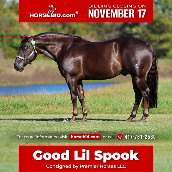 🎲𝓽𝓱𝓮 𝐑𝐈𝐃𝐄𝐑'𝐒 𝓒𝓱𝓸𝓲𝓬𝓮🎲 Happening now thru MONDAY | NOVEMBER 17th - Available EXCLUSIVELY on HorseBid's website! For more details and to register visit: www.Horsebid.com CONSIGNOR CONTACT: Premier Horses LLC 417-761-2580 LOCATION: Buffalo, Missouri BREED: Quarter Horse REGISTERED: Yes REGISTERED NAME: Good Lil Spook - Sired by Smart Spook and NRHA Money Earner COLOR: Chestnut HEIGHT: 14.3 AGE: 5 GENDER: Stallion Say hello to Good Lil Spook, better known around the barn as “Hitman.” This gorgeous dark liver chestnut stallion is the kind that turns heads everywhere he goes — not just for his looks, but for his talent, temperament, and quiet confidence. Hitman is sired by the legendary Smart Spook, an NRHA $8.5 Million Dollar Sire with lifetime earnings of over $405,000, and out of a money-earning, producing dam whose foals continue to carry forward that proven performance heritage. With that kind of lineage, it’s no surprise that Hitman has both the genetics and the ability to excel in the show pen and become a valuable asset in any breeding program. He is the picture of balance and quality — big-boned, thick-made, and conformationally flawless, yet still refined with that classic baby-doll head everyone loves. His rich liver chestnut coat gleams in the sunlight, and his long, full mane and thick tail only add to his striking presence. Every detail about him, from the way he carries himself to the softness in his expression, speaks of a horse with both class and character. In the arena, Hitman is all business — powerful, correct, and stylish. He’s been shown successfully in the Level 4 Open, marking a solid 217, and has earned over $1,600 NRHA. He’s a huge stopper who slides deep and straight, with quick, snappy spins and fast, effortless circles that stay soft in the bridle. His lead changes are seamless, and his cadence and rhythm make him a pleasure to watch and to ride. He’s the kind of horse that makes it easy to look good in the show pen. But what truly sets Hitman apart is his incredible disposition. For all his talent and power, he is remarkably kind and quiet. He loves people and greets everyone who walks by his stall with a nicker. Around the barn, he’s as easy as they come — respectful, gentle, and eager to please. Even though he’s a stallion, he handles and rides with the mind of a gelding. Our 6-year-old daughter rides him regularly, and the two of them absolutely adore each other. He’s patient, steady, and has that rare, trustworthy nature that makes him a barn favorite. Outside the show pen, Hitman is as versatile as he is dependable. He enjoys going down the trail and takes everything in stride — crosses bridges, obstacles, and water of any depth without hesitation. He’ll open and close gates, check the mail, and even work cattle, always calm and confident no matter the setting. His surefootedness and quiet confidence make him a joy to ride anywhere. Good Lil Spook is the complete package — world-class pedigree, proven show record, flawless conformation, and a golden disposition. Whether you’re looking for your next show horse, a top-tier addition to your breeding program, or simply a kind partner with the looks and personality to win hearts, Hitman is the kind of stallion that doesn’t come along often. He has passed a pre-purchase exam.