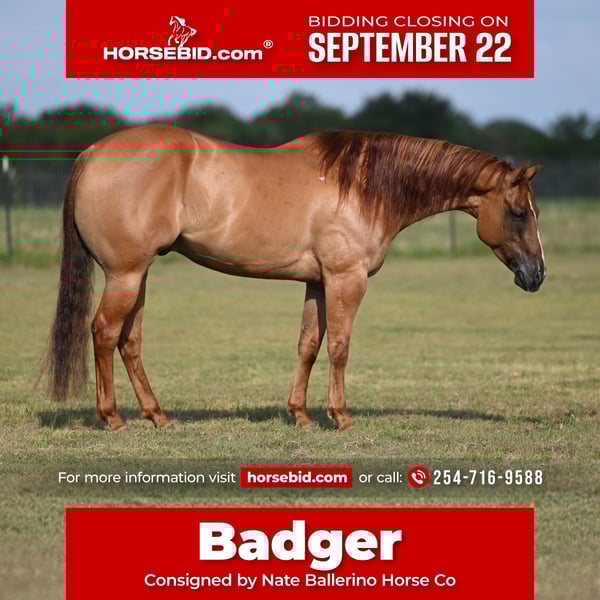 🍁𝒕𝒉𝒆 𝐅𝐀𝐋𝐋 𝑺𝒑𝒆𝒄𝒕𝒂𝒄𝒖𝒍𝒂𝒓🍁 Happening now thru MONDAY | SEPTEMBER 22nd - Available EXCLUSIVELY on HorseBid's website! For more details and to register visit: www.Horsebid.com CONSIGNOR CONTACT: Nate Ballerino Horse Co 254-716-9588 LOCATION: Waco,Tx BREED: QH REGISTERED: Yes REGISTERED NAME: Badger Commander COLOR: Red Dun HEIGHT: 15 AGE: 5 GENDER: Gelding