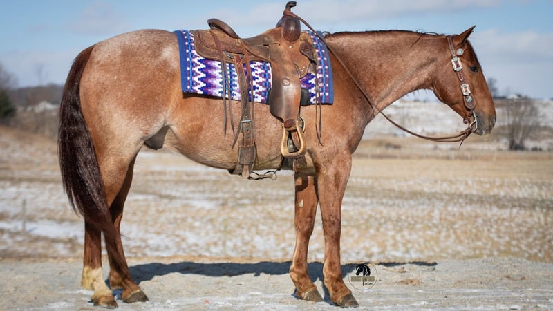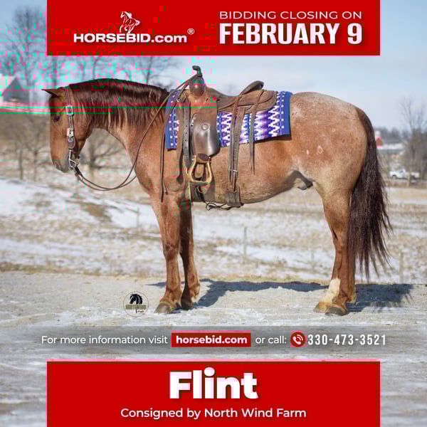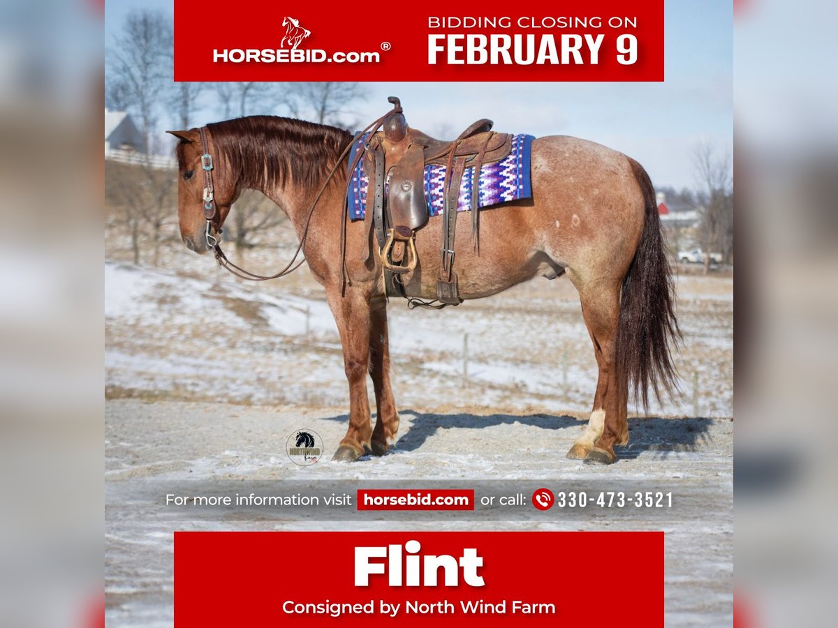 ❤️🔥𝑩𝒆 𝑴𝒊𝒏𝒆 𝐒𝐄𝐋𝐄𝐂𝐓❤️🔥 Happening now thru MONDAY | FEBRUARY 9th - Available EXCLUSIVELY on HorseBid's website! For more details and to register visit: www.Horsebid.com CONSIGNOR CONTACT: North Wind Farm 330-473-3521 LOCATION: Fredericksburg, OH BREED: AQHA REGISTERED: Yes REGISTERED NAME: Huskers Ticket COLOR: Red Roan HEIGHT: 15 AGE: 6 GENDER: Gelding Introducing Huskers Ticket AKA “Flint” is a 6 yr old registered AQHA gelding, standing at 15hh! Flint is well trained to ride! He is a gentleman on the ground and has really good manners! He loves turnout and is easy to catch in the field! He stands nicely for tacking up, grooming, and for bathes! He picks up his feet as well! Flint is an easy keeper and requires no maintenance! Flint is very fun to ride! He has a very smooth walk, trot, lope and a nice stop! He has easy cues and is responsive! He will ride western and bareback! He will also ride bridles! He will neck rein and direct rein! He has a slow pivot and a side pass! Flint rides great on the trails! He will cross creeks, step over logs, and is sure footed. He will cross all the obstacles and doesn’t mind the tarp or the ball! He is not easily spooked and is the same horse every day you ride him. He is used to being around dogs and atvs! We have rode him on the state route and he is traffic safe! He is a seasoned trail horse and very fun to ride in the arena, he is talented and safe! He is suitable for all levels of riders. Flint would be a great ranch riding prospect. He is fun, safe, and reliable! Contact us for more info on this gorgeous gelding!