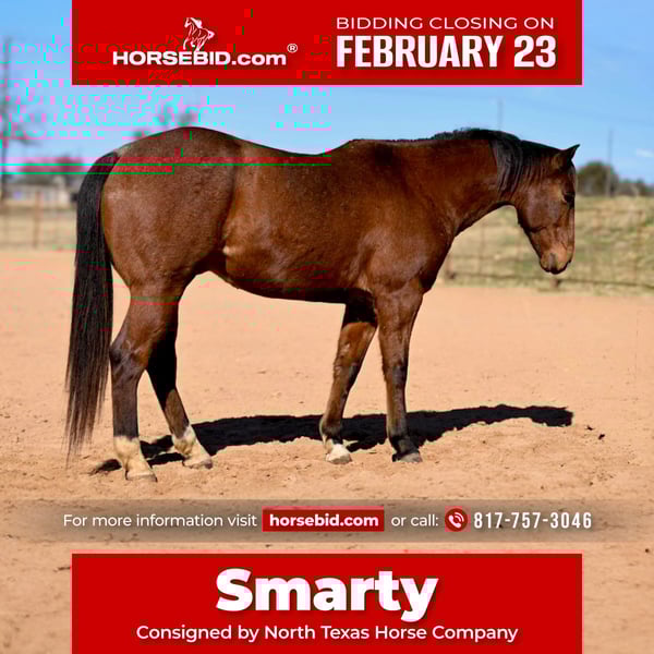 💎 𝐓𝐇𝐄 𝓓𝓲𝓪𝓶𝓸𝓷𝓭 𝐒𝐇𝐎𝐖𝐂𝐀𝐒𝐄 💎 Happening now thru MONDAY | FEBRUARY 23rd - Available EXCLUSIVELY on HorseBid's website! For more details and to register visit: www.Horsebid.com CONSIGNOR CONTACT: North Texas Horse Company 817-757-3046 LOCATION: Weatherford, TX BREED: QH REGISTERED: No REGISTERED NAME: Smarty COLOR: Bay HEIGHT: 15.1 AGE: 6 GENDER: Gelding Smarty is a 6 year old, 15.1 hand bay gelding and he is the definition of FUN. If you’re looking for a handy ranch or pleasure horse that anyone can climb on and enjoy, he’s your guy. He is simple, user friendly, and goes exactly where you point him every single time. No nonsense, no drama. He’s covered miles and miles of trails and walks right through water without a second thought. He’s confident, steady, and happy to go wherever you ask. In the arena he’s just as impressive. Smarty lopes around smooth and collected, stays soft in your hand, and feels great every ride. He’s been over obstacles and would be a perfect match for someone who wants to hit the trails but also step into ranch versatility or trail classes for fun. He’s one hand broke, moves easily off your leg, and is the kind you can open and shut gates on without a struggle. There is zero buck, bolt, or rear in him. He truly wants to please and takes care of his rider. He is incredibly comfortable and just flat enjoyable to ride. With his size, build, and handle, he could also make a standout roping prospect. He is UTD on teeth, feet and coggins!However you choose to use him, you’re going to have a blast. Smarty is the kind that makes you look forward to saddling up. More pics and videos on his website page at northtexashorsecompany.com/smarty. Please call Blair with North Texas Horse Company for more info at 817-757-3046. We are located in Weatherford, TX and can help arrange affordable shipping to anyone!