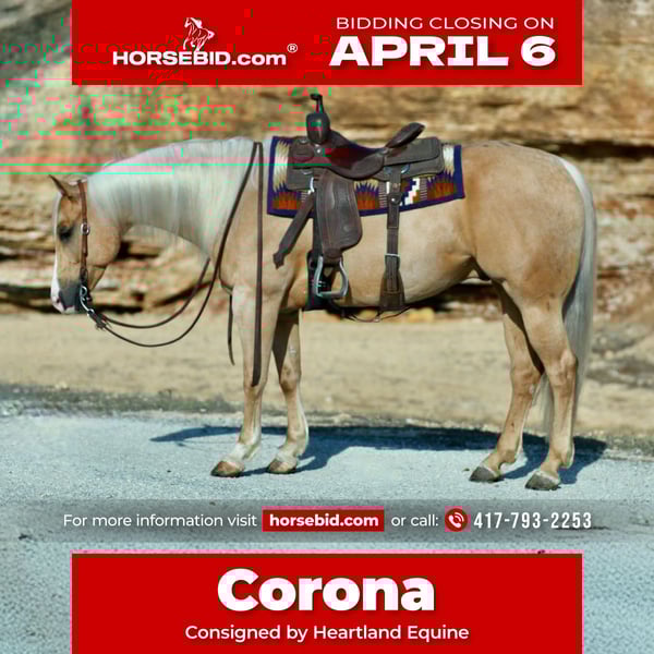 🌟𝑨𝒑𝒓𝒊𝒍 𝐀𝐋𝐋 𝐒𝐓𝐀𝐑 𝐋𝐈𝐍𝐄𝐔𝐏🌟 Happening now thru MONDAY | APRIL 6th - Available EXCLUSIVELY on HorseBid's website! For more details and to register visit: www.Horsebid.com CONSIGNOR CONTACT: Heartland Equine 417-793-2253 LOCATION: Mt Vernon, MO BREED: Quarter horse REGISTERED: Yes REGISTERED NAME: Meradas Lil Corona COLOR: Palomino HEIGHT: 15.1 AGE: 6 GENDER: Gelding Corona is a gorgeous 6 year old palomino gelding standing 15.1 hands. His pedigree is loaded with some of the greatest horses in AQHA history: Wimps Little Step, Smart Chic Olena, Bob Acre Doc & Freckles Merada (to name a few!). This young gelding is as classy and broke as they come, you do not want to miss out on Corona. Everyone wants a gelding with all the fancy buttons- here he is! Corona has been in talented hands his entire riding career. He was started and brought up correctly. Rides both in and out of the arena, great out on trails. Picks up both leads with ease, neck reins, light in the bridle and easy to ride. Moves off leg pressure, side passes and has a beautiful handle. Corona has the potential to go on as a show or 4H horse, a confident youth would have a blast on this horse. Corona is easy to catch, stands quietly to be saddled and is a gentleman to bridle. He loves to be groomed and is good to bathe. Loads and hauls like a dream. Fantastic for the farrier, he is all business! Corona had a minor procedure done last summer on his hock. We are happy to share all vet records (including x-rays) with a serious buyer. He sells 100% sound with a recent vet check on file. This young gelding is guaranteed to be your barn favorite and the best riding partner!
