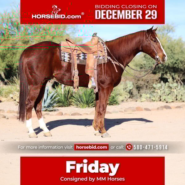 ⚜️ 𝓗𝓮𝓻𝓲𝓽𝓪𝓰𝓮 𝐖𝐢𝐧𝐭𝐞𝐫 𝓒𝓵𝓪𝓼𝓼𝓲𝓬⚜️ Happening now thru MONDAY | DECEMBER 29th - Available EXCLUSIVELY on HorseBid's website! For more details and to register visit: www.Horsebid.com CONSIGNOR CONTACT: MM Horses 580-471-5914 LOCATION: Cave Creek, AZ BREED: Aqha REGISTERED: Yes REGISTERED NAME: Mr Friday Thirteen COLOR: Sorrel HEIGHT: 15.1 AGE: 5 GENDER: Gelding Friday is fits his name because everyone looks forward to Friday. He is 15.1 and made like one is supposed to be. He is trained in the reining and does all manuevers correctly. He has been ridden outside on the trails a lot. Used to gather cattle, ridden in town and is started nicely in the roping. Friday is always gentle and if he can hear or see you will be waiting for you at the gate. He has been ridden by all ages and levels of riders and not ever given any trouble. He stays gentle with time off. He is sound in every way. And doesn’t have any bad habits. If you want a nice easy gelding that you anyone can ride to do multiple stuff on don’t miss him. Watch his video call with questions or come ride him for yourself.