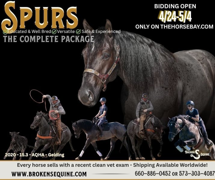 If you’re looking for the kind of horse that mixes talent and looks, all while taking care of his rider, this is him. Honest, forgiving, and incredibly intuitive, he’s the definition of amateur friendly. He is confidence building for riders of all levels and the same steady partner every single day. He doesn’t just excel in one lane; he’s the rare type that can step into the show ring, quietly pack someone around in English or western, or go put in a solid day’s work on the ranch without missing a beat. Versatile, dependable, and safe in every sense of the word, he’s the kind you can trust to do it all—and do it well, any day, in any place. Spurs is a 2020 Quarter Horse gelding standing 15.3 hands tall. He is what dreams are made of. There is nothing this horse cannot do. He makes whoever climbs on his back look, and feel, like a pro. You feel pure joy every time you climb into his saddle. He is steady, deliberate, and has all of the buttons without being reactive. Everything about this horse is right—His looks, his brain, and his education. He has been a barn favorite, and I’m not sure we will ever have another quite as special as him. Under western tack, Spurs has been used extensively outside — doctoring cattle, sorting, and gathering pastures. He knows a day’s work and handles cattle with confidence. He will rope both ends, is stout to the horn, and has a ton of cow. Spurs was started on the Barrel pattern and did 90 days in a barrel program. Spurs circles well, has great lead departures, powerful spins, and a big stop. He knows all of the maneuvers and can go in any direction and be successful. Under English tack, Spurs is a dream. Seamlessly put together dressage tests, jump around courses in the ring, or hit the cross country field. He is smooth, comfortable, and easy to ride. His gaits are adjustable, he is soft in the bridle, and his brain is unbeatable. Anything you ask of him, he does well. He’s the ideal amateur horse as he is kind, forgiving, and always building confidence. On the trails and off property, Spurs is a professional. He is safe, sure footed, and reliable wherever you take him. From camping trips, off property trips to school and train, trail rides, and trips to town, Spurs has proven to go into any place or situation calmly and like he’s been there a thousand times before. He crosses water, swims, is safe in busy traffic, and crosses any obstacle you point him at. He will ride happily alone, or in a group. He’s great to trailer and is easy to load and travel with. In the barn, Spurs is a great horse to be around. He is a good boy for all the usual barn tasks and genuinely enjoys being around his people. He’s happy living inside or out and is an easy keeper. Spurs has a kind and gentle personality that everyone loves. He’s respectful, personable, and a joy to have in the barn. ⚫️Spurs is an easy keeper that requires no maintenance.