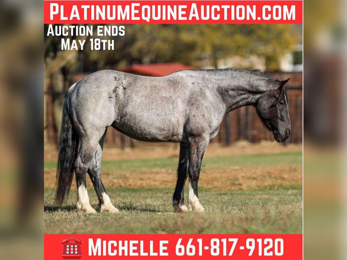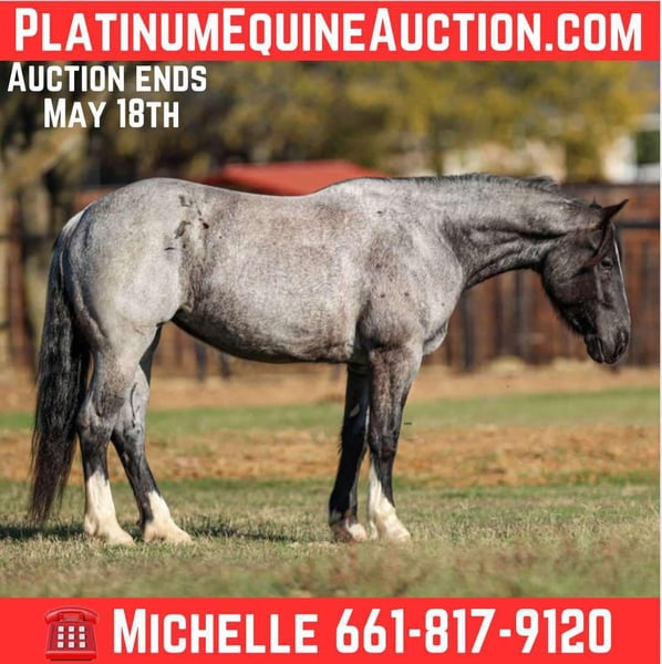 ONLINE AUCTION Place your bids at www.PlatinumEquineAuction.com Starting Bid $3500 Auction ends May 18th, 2025 Need a new saddle? Check out White Rock Saddles on our website or Facebook! Are you ready to add a touch of class to your barn? Look no further than our stunning blue roan mare, Alexander’s Pistol Annie, affectionately known as Blue Bell around the barn. This 2020 model is not just any horse; she’s a one-of-a-kind beauty registered with the American Shire Horse Association Sport Horse Registry. Standing 15.3 hds tall and as stout as one comes. Blue Bell is the whole package! With all the right buttons to make her a versatile partner, she’s ready for you to mold her into your dream horse. She’s been started over jumps and shows incredible promise as a hunter-jumper or a 3-day eventer. And let’s not forget her dressage potential—her floaty trot and canter are sure to turn heads in the arena! This mare is athletic, eager to learn, and always willing to please. Blue Bell glides through a walk, trot, and lope with beautiful, smooth transitions. She’s soft in the mouth, breaks at the poll, and has a big, impressive sliding stop that will leave you in awe. Blue Bell isn’t just a pretty face—she’s also a seasoned traveler! She’s been hauled to barrel races and ropings, proving to be completely unbothered by the hustle and bustle. Whether it’s a fun ride down the trails or a trip to the historic Fort Worth Stockyards, with horse-drawn carriages, loud music, and heavy traffic, she remains calm and collected, always stealing the show with her stunning looks. Her trail riding skills are top-notch; she confidently crosses logs, bridges, and water, tackling any terrain with ease. Blue Bell has even ventured into the mountains and rocky paths, proving her versatility. Plus, she has a natural knack for ranch work, showing off her impressive cow sense as she learns to pen rope and heel the donkey. Gentle and sweet, Blue Bell is a dream to handle—whether in the stall or out in the pasture. She’s easy to catch, stands patiently for the farrier and vet, and is a breeze to bathe. Loading and unloading from the trailer is a non-issue. Don’t miss out on the opportunity to own this extraordinary blue roan mare that will make all your friends and neighbors jealous. Blue Bell is ready for her next adventure with someone who appreciates her unique charm and versatility. Come see her in person! Or if you aren’t able to make it schedule a FaceTime showing with us. If you need help with transport don’t hesitate to ask we have a list of reputable haulers that can get her safely to your doorstep WORLD WIDE including, Alaska , Mexico, Hawaii and Canada. Contact M $ Performance Horses Michelle 661-817-9120 with any questions or to make a Buy It Now Offer. Located in Stephenville, TX. ONLINE AUCTION Place your bids at www.PlatinumEquineAuction.com Starting Bid $3500 Auction ends May 18th, 2025 Need a new saddle? Check out White Rock Saddles on our website or Facebook!