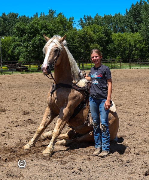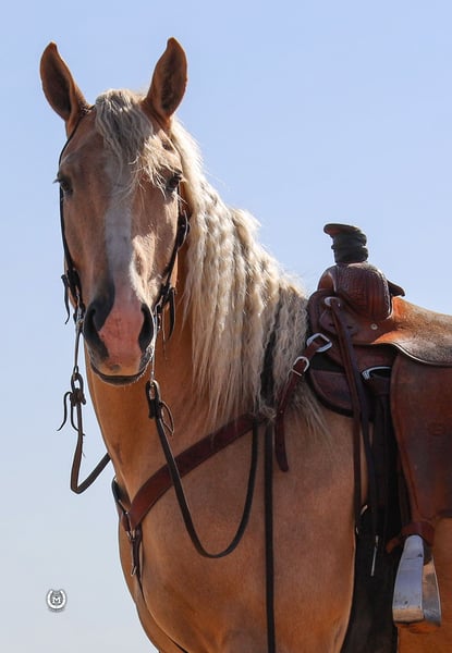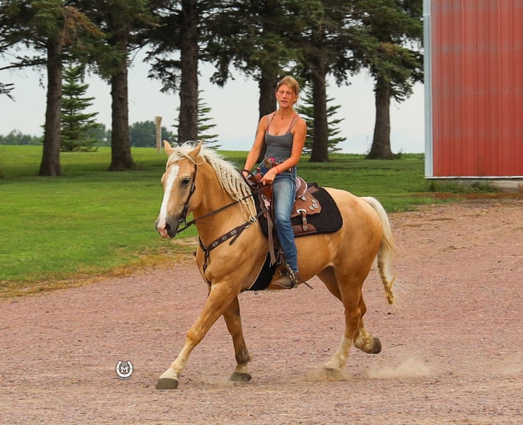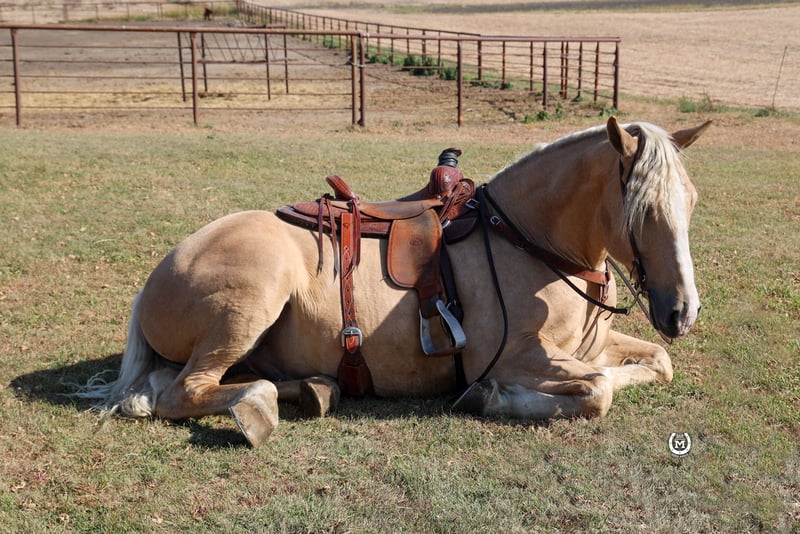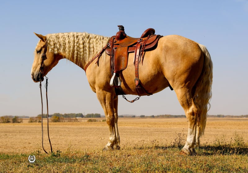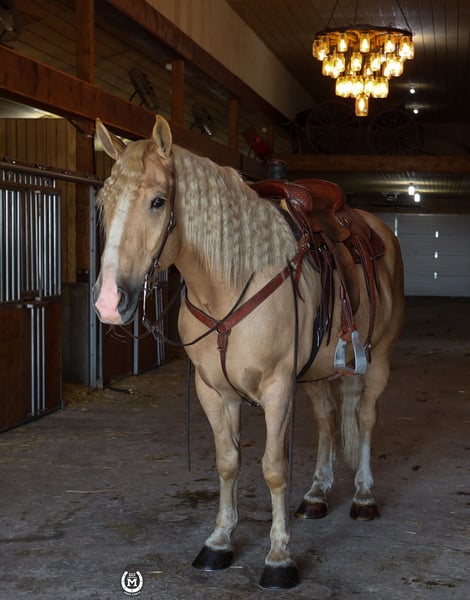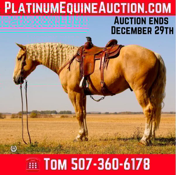 ONLINE AUCTION Place your bids at www.PlatinumEquineAuction.com Starting Bid $3500 Auction ends December 29th, 2024 Need a new saddle? Check out White Rock Saddles on our website or Facebook! Bar M’S Dallas is a gorgeous 2020 Palomino draft/ quarter horse cross gelding. He stands 16.1 hands tall. He is broke to ride the very best.He will take either lead and lope out of his tracks. He will stop and turn around like a 14.1 quarter horse. He had been ridden a lot in the arena and has hundreds of miles of trails under him. He has been used to direct traffic at large events. He will side pass to the mounting block. Dallas will lay down on command as well as sit up like a dog. He loads and hauls like a seasoned horse. Dallas will be the same horse every time he is saddled whether that’s every day or once a month. He stands for the farrier. Dallas loves his bath time as well. He has a huge heart and will work all day for whatever you ask of him. Dallas is sure to stand out with that beautiful Palomino color!! This big pretty gelding is suitable for just about any level of rider, making him a perfect fit for the entire family. Dallas is current on all his vaccinations. Please call Bar M Horse Ranch Tom with any questions at 507-360-6178 Located in Windom, MN. ONLINE AUCTION Place your bids at www.PlatinumEquineAuction.com Starting Bid $3500 Auction ends December 29th, 2024 Need a new saddle? Check out White Rock Saddles on our website or Facebook!