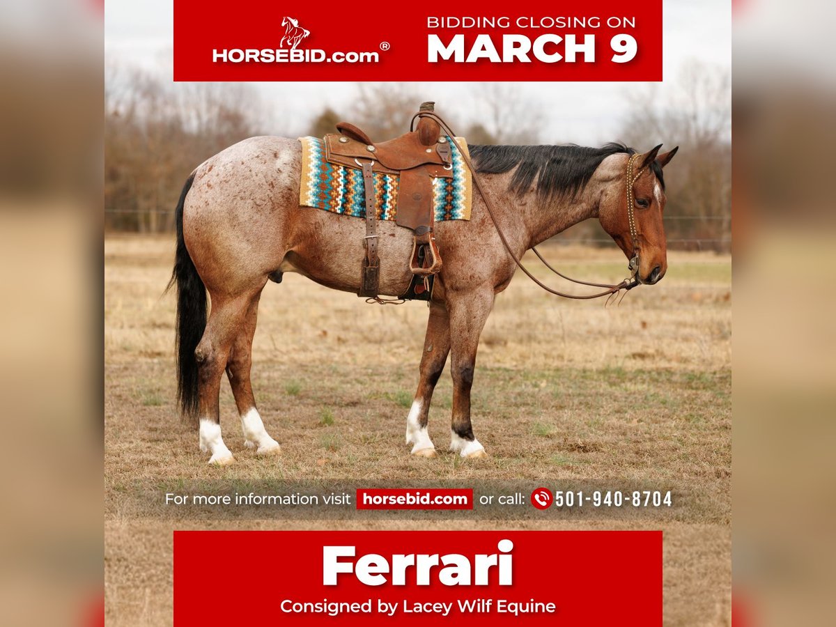 ℳ𝒶𝓇𝒸𝒽 ♦️𝐑𝐈𝐃𝐄𝐑'𝐒 𝐂𝐇𝐎𝐈𝐂𝐄♦️ Happening now thru MONDAY | MARCH 9th - Available EXCLUSIVELY on HorseBid's website! For more details and to register visit: www.Horsebid.com CONSIGNOR CONTACT: Lacey Wilf Equine 501-940-8704 LOCATION: Quitman, AR BREED: Quarter Horse REGISTERED: No COLOR: Bay Roan HEIGHT: 16.2 AGE: 6 GENDER: Gelding Ferrari is the kind that makes you rethink your standards. At 6 years old and standing a commanding 16.2 hands, this bay roan Quarter Horse gelding is equal parts presence and practicality. He’s a “point him and go” type that rides out solo with confidence or falls quietly into a group without drama. Water, logs, ditches, rough country, uneven ground… he handles it all like it’s just another day at the office. No theatrics. No hesitation. Just steady. In the arena, he’s refreshingly uncomplicated. He picks up both leads with ease, stays soft in the bridle, and responds honestly to leg pressure. His stop is correct, his rollback is balanced, and his lope is a true rocking chair you could sit on all afternoon. Smooth, cadenced, and easy to stay with. Switch tack and he steps into English just as naturally, carrying himself with a balanced, forward way of going and a polished headset that makes him look every bit as good as he feels. His impressive resume extends far past the arena. Ferrari has been used extensively at the stockyards, penning, sorting, and loading cattle with confidence and sense. Town traffic doesn’t phase him either. Noise, movement, pressure… he stays the same horse. On the ground, he’s just as solid. He’s easy to catch, groom, saddle, bathe, load, and shoe. He gets along well with other horses and is just as content in a stall as he is turned out in the pasture. No fuss. No nonsense. Big, broke, and built to cover ground with ease, Ferrari is 100% sound and ready to go on with. He’s the kind that doesn’t need babysitting or micromanaging. He shows up, does his job, and makes the ride enjoyable every single time! Watch his full Youtube video, feel free to reach out with any questions, and arrange a visit or a FaceTime with Ferrari!