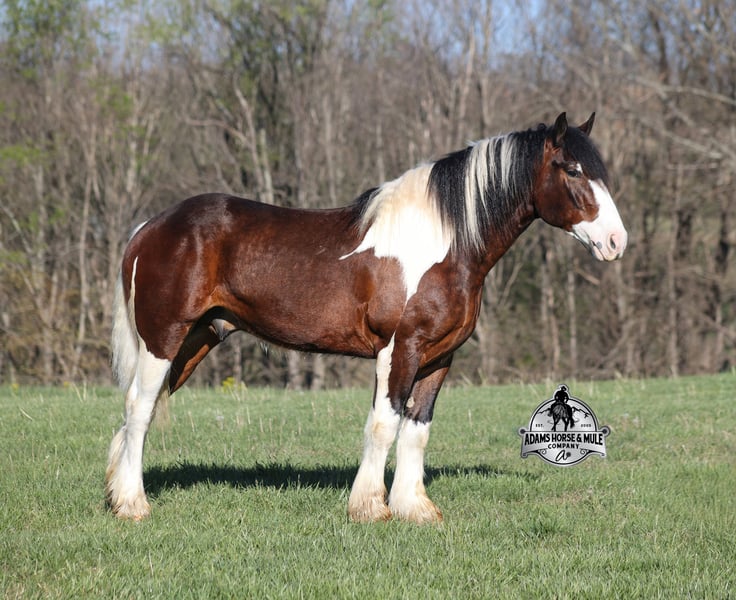 2 week Guarantee- Go to visit our website for more pics and video link at www.AdamsHorseAndMuleCo.com AHAMC has been in the horse business and sold horses over the internet since 2005. We have a long track record of success with hundreds of happy customers. We work hard to match riders with the correct horses and specialize in beginner safe, family friendly horses that have been used and checked out by our family! We can set up transportation anywhere in the US and look forward to working with you. Take a Chantz and find the love of our life! This beautiful bay tobiano gypsy draftcross that stands around 16.1hh, that will weigh around 1450lbs and he is a 6 years old is no chance at all! He is 100% the real deal in every aspect. Chantz has been through the natural horsemanship program and knows some tricks such as to lay down on command and he sets like a dog. Chantz is going to build your confidence as he will take care of all sizes and ages of riders. They don’t get too young or too old for this guy, he will take the best of care of his rider in all situations! He is well broke in the bridle, he lopes nice circles, has a smooth jog, stops on a dime and reins around really well. He has been ridden down the highways and he is traffic safe. He is broke to work under harness in all types of wagons and farm machinery, single, double or quad. Chantz is great on trails and he will cross creeks, ditches, logs and navigate rough rocky areas. He has been ridden at night on coon hunts, had guns shot off of his back and led dogs. He has been exposed to all kinds of wildlife such as deer or turkey or other animals like cows or dogs and will go anywhere that he is asked too. He has been ridden many miles in the mountains of Eastern Kentucky and encountered every obstacle possible on the trail. He will go up or down even the steepest slopes, across deep creeks, over downed trees, and over all types of rough terrain while still being sure footed. Chantz has been used to pen cattle at the stockyards, has worked on the ranch and in the branding pen. Chantz is the PERFECT addition to any family as he is just a big puppy at heart!!! Feel free to call Eric 606-308-2461 with any questions.