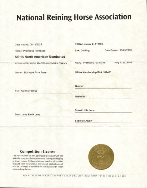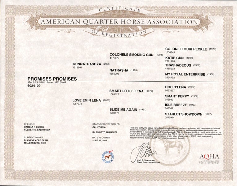 His name says it all—Promise is a horse that delivers. From his impressive breeding to his size, color, and temperament, he is built to impress. Born in 2019, this 14.1-hand Dark Sorrel AQHA Gelding is an own son of Gunnatrashya, a Hall of Fame earner with over $200K in earnings, and on the bottom side traces back to the legendary Smart Little Lena. He’s NRHA licensed, making him an ideal prospect for showing, yet his calm, sensible nature makes him perfect for the trail, ranch work, or casual riding. Promise is a head-turner with a long, flowing mane and tail, three white socks, a striking white blaze, flawless confirmation, and that bright, alert eye that exudes intelligence. He is a true all-around horse, equally at home in the show pen or out on the trail. He has already proven himself in the show ring, having been shown in a local ranch show, and continues to excel wherever he goes. He has been exposed to state roads, traffic, and countless trails. He has done ranch work checking cows, fence lines, and our back pasture herd. His gaits are smooth and balanced from walk and trot to extended trot and lope. Promise knows his leads, offers a good lead change, and can even perform a sliding stop, making him comfortable and versatile for performance or pleasure. Promise is just as steady in an indoor or outdoor arena, ridden western, English, or bareback—he never misses a beat. He is easy in the barn, great for the farrier, calm in the wash bay, and loves attention, always the first to greet you at the gate. Confident around tarps, jugs, and whips, he’s the kind of horse you can trail ride today and show tomorrow. Best of all, he is safe and dependable for any level rider—from beginner to senior to advanced, making him a rare find in today’s market. He is up to date on all vaccinations, deworming, and shoeing, and is ready to step into his next home. If this sounds like the horse you have been looking for, please feel free to reach out to Duane @ 330-231-2324 for more information or to schedule a day to stop by and see him in person.