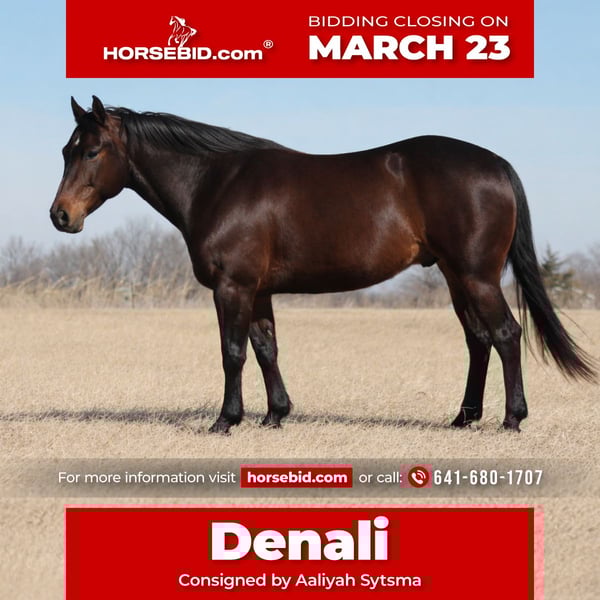 ⚜️𝓽𝓱𝓮 𝐆𝐎𝐋𝐃 𝓢𝓮𝓵𝓮𝓬𝓽⚜️ Happening now thru MONDAY | MARCH 23rd - Available EXCLUSIVELY on HorseBid's website! For more details and to register visit: www.Horsebid.com CONSIGNOR CONTACT: Aaliyah Sytsma 641-680-1707 LOCATION: Cincinnati, IA BREED: AQHA REGISTERED: Yes REGISTERED NAME: Cat Man Time COLOR: Brown HEIGHT: 14.3 AGE: 7 GENDER: Gelding “Cat Man Time” 2019 AQHA gelding- 14.3 hands and wide! ➡️Grandson Highbrow Cat X One Time Pepto Denali has the looks, the pedigree, and the brains to go with! He stands tied, tacks up easy, loads well, rides out alone or in a group. He has seen miles of country side from trail rides and moving cattle. Sure footed, sound, and isn’t afraid to work all day long. He will walk, trot, lope collected circles. Really gets under himself with his stop, pivots and side passes. Very fancy gelding that will be a jam up heel horse or using horse! Never offered to buck, bite, rear, or kick. But not a good fit for a beginner as this dude has buttons and naturally rides catty. Denali has no blemishes, fresh set of shoes all the way around, never taken a lame step a day in his life, no health issues. His one and only vice- he will crib in a box stall if he does not have on a cribbing collar. He will not do it in metal stalls, will not do it in the pasture, and will not do it if turned out.