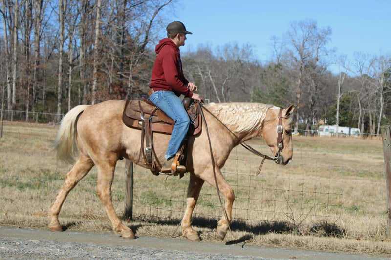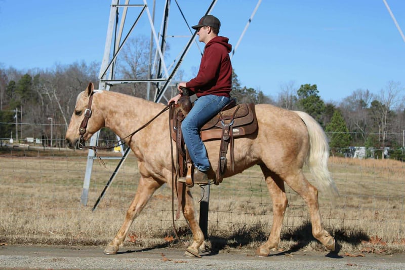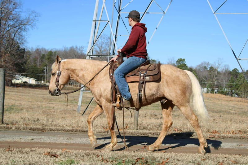 "AVAILABLE ON ONLINE HORSE AUCTION AT www DOT PlatinumEquineAuction DOT com BIDDING OPEN NOW thru SUNDAY | FEBRUARY 15TH! *Final price will be determined on auction site* CONSIGNOR CONTACT INFO: Maxwell Family Farms 704-689-9035 LOCATION: Cherryville, NC Zip is an 7 year old grade palomino gelding. He stands at 14.3 hands with a strong foot and sturdy build. He is easy on the eyes and has a great head on his shoulders. We have been trail riding all over the mountains of western NC! Zip will walk, trot, lope with ease and elegance. You can see how unbothered he is by anything you throw his way. He is gentle every day and suits anyone. Laid back enough for the trail rider to enjoy. Zip has an amazing personality anyone would love!! Don’t miss out on this handsome gelding! Sells 100% sound and sane. • Call Landon at 704-689-9035 for more info! - Also can schedule a FaceTime call to meet Zip! • Cherryville NC affordable shipping is available!