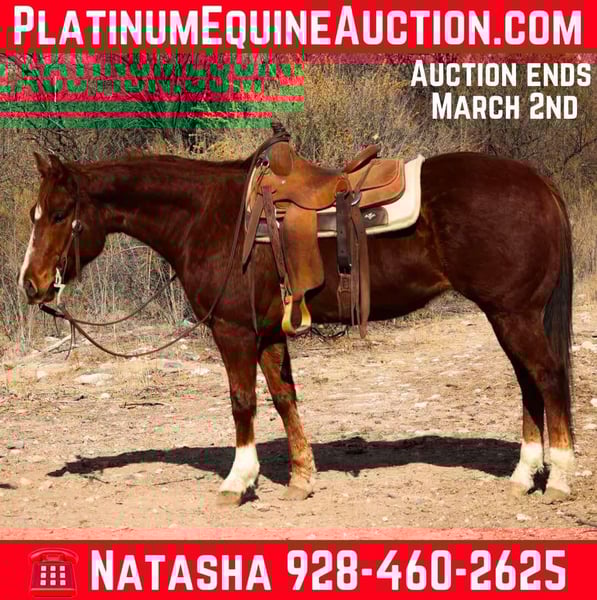 ONLINE AUCTION Place your bids at www.PlatinumEquineAuction.com Starting Bid $3500 Auction ends March 2nd, 2025 Need a new saddle? Check out White Rock Saddles on our website or Facebook! Buddy is a 6 year old grade gelding standing 14.3hh. If you’re looking for your next trail partner then look no further, Buddy is your guy!! Nestle through thick brush, crawl through rocky riverbeds, swim through flowing rivers, climb up and down steep rough terrain, cruise through the busy streets of town. You name it and Buddy will go through it without batting an eye, surefooted and gentle as can be!! Buddy is safe, gentle, and reliable with absolutely no spook or buck. Buddy will also walk, trot, and lope both ways with ease. Buddy is easy to catch and good to groom, saddle, bridle, bathe, load, and shoe! Will come with a clean coggins and health!! Located in Camp Verde, AZ Contact D/C Equine Services Dallas 804-822-2233 or Natasha 928-460-2625. ONLINE AUCTION Place your bids at www.PlatinumEquineAuction.com Starting Bid $3500 Auction ends March 2nd, 2025 Need a new saddle? Check out White Rock Saddles on our website or Facebook!