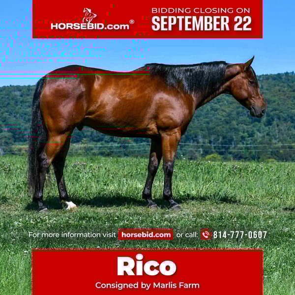 🍁𝒕𝒉𝒆 𝐅𝐀𝐋𝐋 𝑺𝒑𝒆𝒄𝒕𝒂𝒄𝒖𝒍𝒂𝒓🍁 Happening now thru MONDAY | SEPTEMBER 22nd - Available EXCLUSIVELY on HorseBid's website! For more details and to register visit: www.Horsebid.com CONSIGNOR CONTACT: Marlis Farm 814-777-0607 LOCATION: Rebersburg, PA BREED: Quarter horse REGISTERED: No COLOR: Bay HEIGHT: 15 AGE: 6 GENDER: Gelding “Rico” is a stunning 6 year old gelding standing at 15 hands tall. Rico has a very sweet personality and is very well minded beyond his years. Rico has a “been there done that” attitude, he trail rides the best, works cattle, loves to jump and will even pack the kids around bareback in the yard! He is truly a well-rounded, safe, versatile gelding! In the arena, Rico has a smooth and floaty walk, trot, canter. He picks up both leads, has a good stop, back up and neck reins! He collects in the bridle and has a soft snaffle mouth! Rico is honest and brave over fences and would make an exceptional hunter/jumper, fox hunter, cross country or eventing horse as well as being the perfect addition to a lesson program! On the trails, Rico is safe, surefooted and dependable! He has the stamina to do the long weekend trail rides or is just as happy to do a short evening sunset hack around the farm! He rides out alone or in a group, crosses water, bridges, up and down steep inclines and is traffic safe! Rico takes care of his rider and is a true confidence builder! At home, Rico is a good boy for all the normal barn tasks. He is excellent for the vet, farrier and dentist. He stands tied anywhere, he’s good to bathe, clip, groom, tack, load and unload. He’s happy in a stall or can be turned out in a mixed herd and gets along with everyone! Rico is very simple, easy and zero drama! For more info or to schedule a visit to meet Rico, call Mark @ 814-777-0607