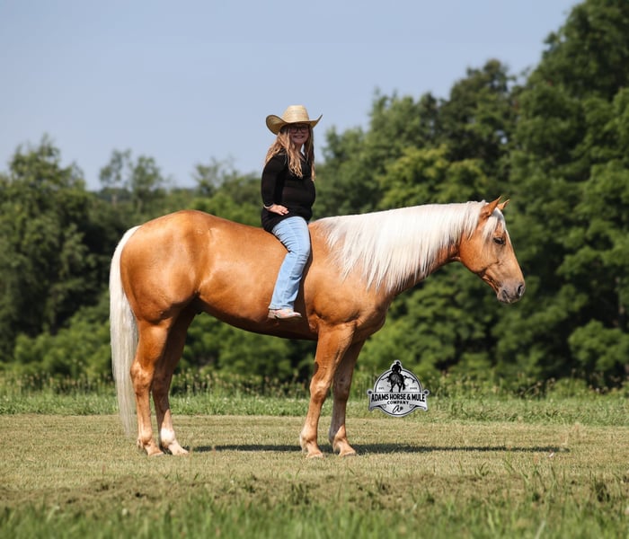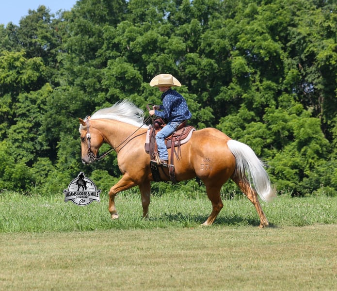 Cinco is consigned to the Best Of The West Horse Sale in Gladstone, NJ on September 26-27th. You can bid online or bid in person. There is a preview day before the sale or you can come ride him prior to the sale in Mt. Vernon, KY. Cinco is a 2019 reg AQHA, 15h, stout built, Golden Palomino, Gelding. He has enough color and personality to steal your heart! The best part about him, is that he is gentle and safe!!! The kids have ridden Cinco down the trails and he is going to take care of any rider that is setting on him! He will pack a nervous beginner safely across rocky areas, creeks, over deadfall, up/down steep slopes and he will ensure that they have the most enjoyable ride! Cinco has been ridden around the ranch, he has worked cows, he has roped and doctored sick ones at the feedlot too. Cinco has tracked the roping dummy on the head and heel side. He is a pleasure to ride as he lopes perfect circles on a draped/loose rein, he has a smooth jog, a good stop, spins a circle both ways and backs with ease. In addition to western riding, Cinco has been ridden English and has been over jumps. He has been ridden through town and is traffic safe! From jumps to ranch to trails Cinco can handle it all and will be a family favorite! For more info call 606-308-2461.