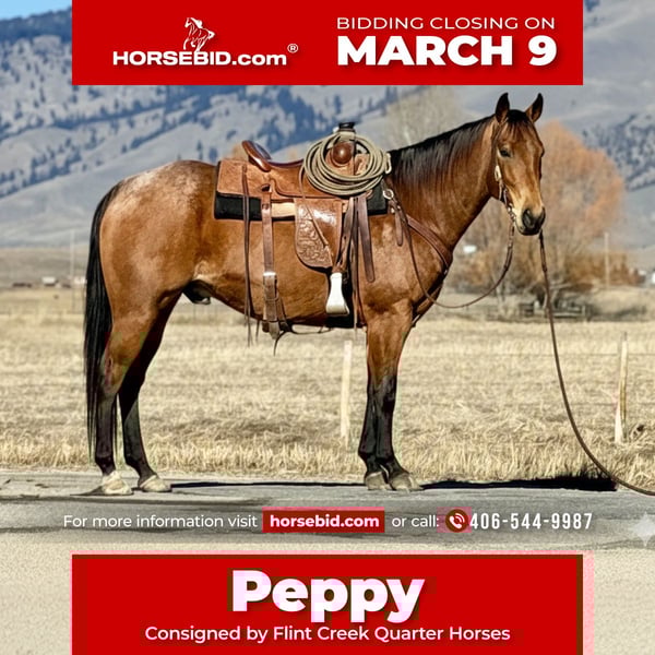 ℳ𝒶𝓇𝒸𝒽 ♦️𝐑𝐈𝐃𝐄𝐑'𝐒 𝐂𝐇𝐎𝐈𝐂𝐄♦️ Happening now thru MONDAY | MARCH 9th - Available EXCLUSIVELY on HorseBid's website! For more details and to register visit: www.Horsebid.com CONSIGNOR CONTACT: Flint Creek Quarter Horses 406-544-9987 LOCATION: Drummond, MT BREED: Quarter horse REGISTERED: Yes REGISTERED NAME: HL Olenas Peppy COLOR: Buckskin Roan HEIGHT: 15 AGE: 7 GENDER: Gelding HL Olenas Peppy is an AQHA registered gelding that stands 15 hands tall. He is a stunning buckskin roan that turns heads wherever he goes. He is extremely gentle and will come find you if you’re anywhere he can get to. He loves being around people and has a confident, kind disposition. Peppy is very broke and a pleasure to ride. He neck reins one-handed and goes wherever he’s pointed. He lopes nice, correct circles in the arena and picks up both leads with ease. He walks out well and has a smooth, comfortable trot. He has been used all over the ranch doing a variety of chores, including roping, sorting, and gathering cows in the hills. He’s the kind that can go all day without having to pedal him home. He offers a great combination of feel and hustle, yet stays kind and gentle enough for less experienced riders. Out on the trails he is confident and steady. He crosses water, downed timber, brush, and obstacles with no fuss. He has been on overnight camps and handled everything very well. He has zero buck, no pull back, and is easy to be around in every way. He is trained to step up to a mounting block or fence — just smooch to him and he’ll side step over to make it easy to get on. He trailers, bathes, and shoes well and has no bad habits. This is a really nice gelding in the prime of his life, ready to go to work. He sells 100% sound. If you think he might be a good fit, give us a call or text — we’d be happy to visit with you about him. Call Tom: 406-544-9987
