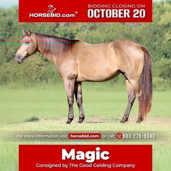 ♦️ 𝐭𝐡𝐞 𝐀𝐌𝐄𝐑𝐈𝐂𝐀𝐍 𝓕𝓪𝓵𝓵 𝓒𝓵𝓪𝓼𝓼𝓲𝓬 ♦️ Happening now thru MONDAY | OCTOBER 20th - Available EXCLUSIVELY on HorseBid's website! For more details and to register visit: www.Horsebid.com CONSIGNOR CONTACT: The Good Gelding Company 903-275-0343 LOCATION: Athens, TX BREED: Quarter horse REGISTERED: Yes REGISTERED NAME: GGC Magic COLOR: Buckskin HEIGHT: 15.1 AGE: 7 GENDER: Gelding If you’ve been searching for that once-in-a-lifetime, do-it-all partner — steady on the trail, broke in the arena, and kind enough for anyone to ride — meet Magic, a 7-year-old, 15.1 hand sooty buckskin gelding. Magic is the kind of gelding everyone dreams of owning. He’s had a solid western foundation, rides collected and soft in the bridle, and is responsive to leg and seat. He’s been used in lessons, making him quiet, forgiving, and trustworthy for riders of every level. Out of the arena, he’s as solid as they come — trail-tested through the Pennsylvania mountains, where he’ll cross water, step over logs, and carry his rider safely through any terrain. In addition to his western handle, Magic has dressage and jumping experience, giving him exceptional balance, body control, and smooth transitions that make every ride a pleasure. He’s also spent time at playdays and fun shows, where he’s proven himself steady, willing, and happy to try new things. Whether you’re after a calm trail companion, a handy ranch-style gelding, or a versatile horse that can switch effortlessly between English and western, Magic checks every box. He’s the type of horse you can enjoy today and trust for years to come. They say a good horse makes every ride feel like magic — this one is Magic. 💛