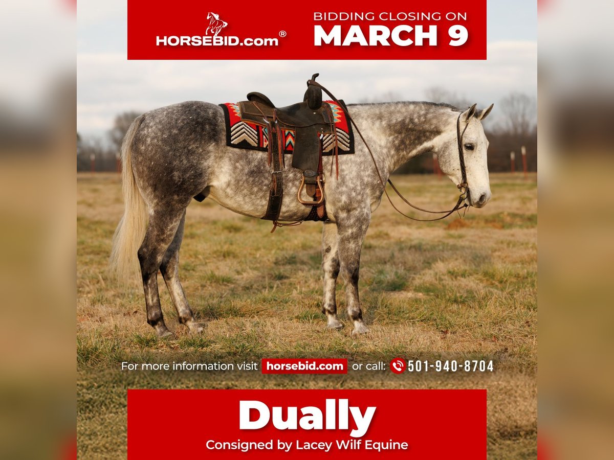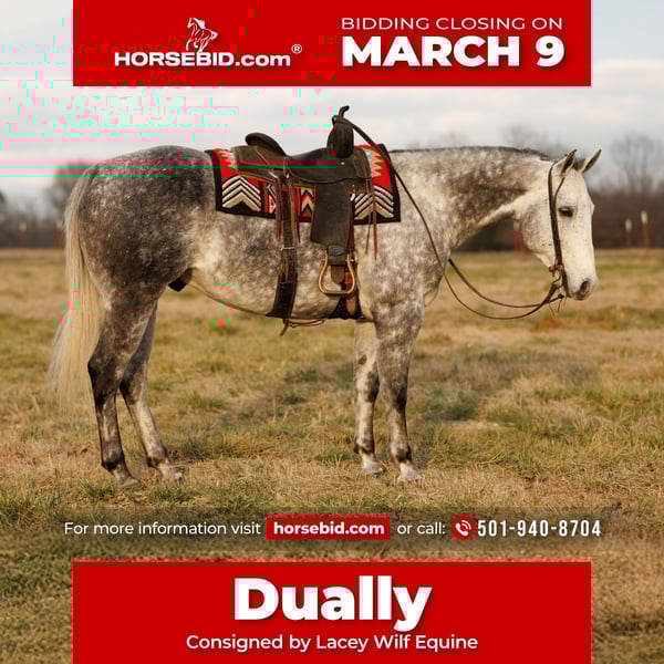 ℳ𝒶𝓇𝒸𝒽 ♦️𝐑𝐈𝐃𝐄𝐑'𝐒 𝐂𝐇𝐎𝐈𝐂𝐄♦️ Happening now thru MONDAY | MARCH 9th - Available EXCLUSIVELY on HorseBid's website! For more details and to register visit: www.Horsebid.com CONSIGNOR CONTACT: Lacey Wilf Equine 501-940-8704 LOCATION: Quitman, AR BREED: Quarter Horse REGISTERED: No REGISTERED NAME: Dually COLOR: Grey HEIGHT: 15.3 AGE: 7 GENDER: Gelding Dually is the kind that feels like he’s read the manual already. Seven years old, 15.3 hands, dapple grey, and very much the “been there, done that” type. He’s spent real time ranching and at the stockyards, working gates, sorting, pushing, and loading cattle like it’s part of his daily routine because it has been. He’s doctored sick calves, handles a rope confidently, and understands how to step into a job without needing it explained twice. Out on the trail, he goes where you look. Logs, ditches, rough ground, water he actually enjoys… he treats it all like part of the adventure. He’s been ridden by all levels of riders and has even packed around lesson students a bit, the kind that makes people feel more capable than they thought they were. He’s well broke in the bridle and through his rib cage, picks up both leads easily, has a big, hard stop when you ask, and a turnaround that’s simply fun. He’ll lope around Western or step into English tack with the same willing attitude, covering ground with a big, eye catching stride. On the ground, he’s just simple. Easy to catch, groom, tack, mount, haul, and shoe. He settles into a stall without fuss and gets along turned out with others just as well. Dually isn’t flashy for the sake of it. He’s useful, seasoned, and quietly confident. The kind of all-around horse that quickly becomes the one you rely on for just about everything. Watch his full Youtube video, feel free to reach out with any questions, and arrange a visit or a FaceTime with Dually!