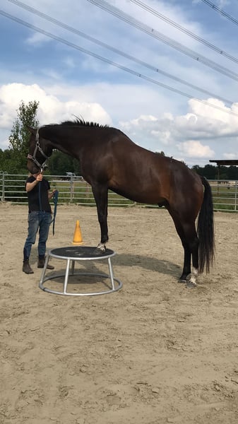 Z dużym żalem sprzedaję mojego 6-letniego wałacha quarter Schoko Schoko ma około 167 cm wzrostu i od początku roku jeździ pod siodłem. Został delikatnie i z szacunkiem dla jego wzrostu wytrenowany na lonży i pod siodłem. Pracowaliśmy dużo na ziemi: zna lonżę, lonżę podwójną, prace ręczne na halterze, woltyżerkę w roundpenie, pracę na kłody, trening równowagi na materacu treningowym oraz trening klikera ze słowem sygnałowym. Jest bardzo wrażliwy i reaguje subtelnie na sygnały ciała od jeźdźca. Potrafi być załadowany do wozu i jeździć w zaprzegu. Schoko potrzebuje doświadczonego jeźdźca, który emanuje spokojem i pewnością siebie, ponieważ obecnie jeszcze łatwo go rozproszyć zewnętrznymi bodźcami. Jego ruchy są miękkie i wygodne do siedzenia. Dobrze przyjmuje uzdę i zna wszystkie podstawowe chodzenia pod siodłem, a także pierwsze półstrony w stępie. Jeśli powoli wprowadzimy go w sytuacje takie jak szkolenia czy mniejsze zawody, Schoko z pewnością sprosta oczekiwaniom swojej rasowej linii. Jest wszechstronny: Aint it the blues x Capuchino Bay. Obecnie Schoko przebywa w stajni otwartej, ale zna również boks z dostępem do pastwiska w ciągu dnia. Niestety, ma alergię na pyłki, która objawia się sezonową egzemą. Dzięki odpowiedniej pielęgnacji skóry i zmianie karmy wspierającej układ trawienny, stan znacznie się poprawił. Schoko jest sprzedawany z pełnym wyposażeniem na życzenie.