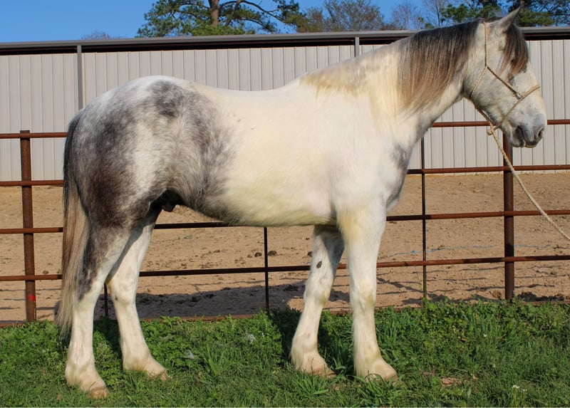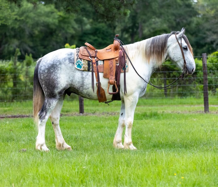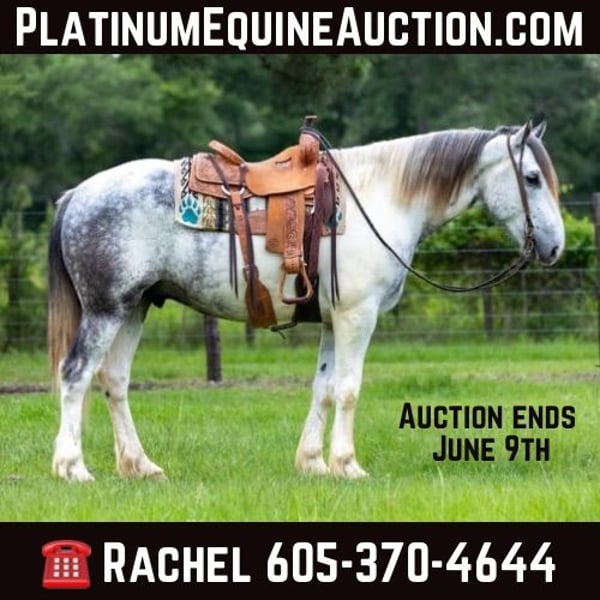 ONLINE AUCTION Place your bids at www.PlatinumEquineAuction.com Starting Bid $3500 Auction ends June 9th, 2024 Need a new saddle? Check out White Rock Saddles on our website or Facebook! Meet Concho, a gentle and affectionate crossbred gelding that will capture hearts wherever he goes! Whether you’re hitting the trails or setting up camp in the hunting grounds, Concho is guaranteed to turn heads. Concho is 8 years old stands at 16.hh and wears a size 4 shoe. He is a absolutely beautiful grey and white paint and has the feathers and bone of a true crossbred! Concho boasts a smooth trot and lope, ensuring a delightful ride all day long. He’s a true gentleman under the saddle, seamlessly opening and closing gates. This solid ranch gelding is versatile, whether you’re dragging calves in the branding pen or embarking on a cattle-doctoring adventure during your next big loop. This surefooted and mild-mannered gelding is not only easy to handle but also makes for the perfect companion on hunting expeditions and pack-in camping trips. He has extensive experience in hunting camps, Concho excels in packing out game and leading a pack-string with ease. Navigating mountains is second nature to Concho, making him an exceptional trail horse. His calm demeanor, sure footing, and easygoing nature make him a joy to ride on any trail. Additionally, Concho shines in the arena, displaying softness, flexibility, and an impressive stop. No matter your equestrian pursuits, Concho is the horse for you. Whether you’re seeking a reliable ranch companion or a stylish performer in the arena, Concho is the epitome of a versatile and well-loved gelding. Don’t miss the chance to bring this exceptional horse into your barn he truly is a favorite that suits riders of all levels! Call or text TR Livestock Rachel 605-370-4644 for more info! Located in Rusk, TX. ONLINE AUCTION Place your bids at www.PlatinumEquineAuction.com Starting Bid $3500 Auction ends June 9th, 2024 Need a new saddle? Check out White Rock Saddles on our website or Facebook!