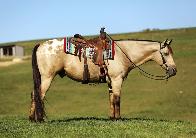 Wow, wow — where can you find a horse like Loyal? This handsome 2019 Quarter Horse cross stands 15.1 hands tall and has one of the most unique color combinations you will ever see. He is a golden buckskin with soft Appaloosa dapples across his hips, four jet-black socks, and a long black mane and tail that shimmer in the sun. His color alone will make you stop and stare, but it is his gentle personality that truly sets him apart. Loyal has been almost everywhere you can think of. He has been down long country trails, across open fields, through creeks and rivers, and up and down steep hills. He has crossed logs, bridges, and ditches without hesitation. He has also been down busy state roads and through town, taking cars, trucks, and traffic noise all in stride. Loyal has been used to check cows and fence lines, and he enjoys having a job to do. He is steady-minded and sure-footed, never in a hurry, but always willing. This gelding has been desensitized to about everything, tarps, jugs, gunfire, whips—and he has even carried the flag. He is confident wherever you take him, whether it is a quiet solo trail ride or a busy group outing. Loyal has also spent plenty of time in both the indoor and outdoor arenas. He knows his leads, moves off leg pressure, and will side-pass right up to the mounting block for you with just a lift of your arm. He rides soft in the bridle, has nice transitions, and listens closely to his rider. Loyal’s movement is as smooth as it gets. His walk is relaxed, his jog is steady and comfortable, and his extended trot covers ground beautifully. His lope is easy to sit in and rhythmic enough to ride all day long. Whether you are a weekend trail rider or someone looking for a versatile all-around partner, Loyal fits the bill. He is the same dependable horse every time you saddle him up. Ride him once a week or once a month, he stays consistent, kind, and ready to go. Loyal has the type of disposition that makes him suitable for anyone, from kids learning to ride to senior riders who want something safe and enjoyable. He is patient, forgiving, and always tries to please his rider. Loyal is up to date on all his vaccinations, shoeing, and deworming, and he is sound and healthy in every way. He is the kind of horse that makes you proud to own him—not just because of his striking looks, but because of his willing heart and steady nature. From the arena to the trails, from parades to pastures, Loyal is a horse you can count on to make every ride a good one. Every time you see him standing there with that golden coat and kind eyes, you will find yourself smiling. Loyal is not just another pretty face, he is a trustworthy, honest partner ready to take care of his next rider, wherever the trail leads. If this sounds like the horse that you have been looking for, please feel free to reach out to Duane @ 330-231-2324 for more information or to stop by and see him in person.