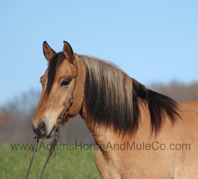 Go to visit our website for more pics and a video. AHAMC has been in the horse business and sold horses over the internet since 2005. We have a long track record of success with hundreds of happy customers. We work hard to match riders with the correct horses and specialize in beginner safe, family friendly horses that have been used and checked out by our family! Ariat is as different as any crossbred that we have had! He is a Fjord/Quarter Horse cross and he has he look of the Fjord with that golden buckskin coloring and the ridability of a quarter horse, so he is the best of both worlds!!! Ariat stands 15.1hh. He will weigh 1200lbs and he is a 2019 model. Ariat is certainly an attractive fellow but there is a lot more to him than what meets the eye! Ariat is everyones best friend as he loves attention and is very calm natured. Ariat is out of the same breeding program as several other top draftcross geldings that we have had over the last 4 years and every one of them has the right mind with the calm nature that makes them great family horses. Ariat has been with us since last year and has completed the natural horsemanship training and has done liberty work and he also knows some tricks such as he will lay down. Ariat has been ridden by every member of our family all the way down to our 6 year old daughter. He has been ridden down the highways and he is traffic safe as well. Ariat is great on trails and he will cross creeks, ditches, logs and navigate rough rocky areas. He has a smooth jog, a VERY VERY nice easy to set lope, a good stop, reins around and turns a circle both ways and backs with ease! He has been exposed to all kinds of wildlife such as deer or turkey or other animals like cows or dogs and will go anywhere that he is asked too. He has been rode many miles in the mountains of Eastern Kentucky and encountered every obstacle possible on the trail. He will go up or down even the steepest slopes, across deep creeks, over downed trees, and over all types of rough terrain while still being sure footed. Ariat is not cinchy, cold backed, does not crib or weave. In addition to riding, Ariat has also been driven down the highways as well. Ariat is a rare find that anyone is lucky to have!!! Feel free to call Eric 606-308-2461 with any questions.