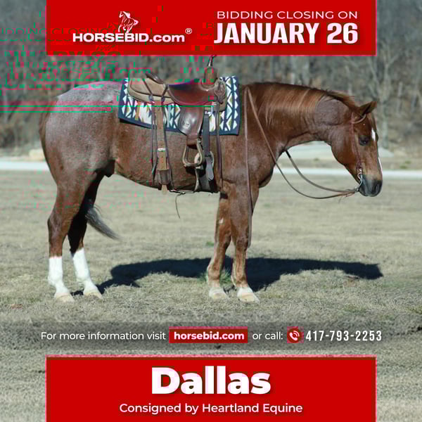 𝐉𝐀𝐍𝐔𝐀𝐑𝐘 ⭐️𝑨𝒍𝒍 𝑺𝒕𝒂𝒓 𝑳𝒊𝒏𝒆𝒖𝒑⭐️ Happening now thru MONDAY | JANUARY 26th - Available EXCLUSIVELY on HorseBid's website! For more details and to register visit: www.Horsebid.com CONSIGNOR CONTACT: Heartland Equine 417-793-2253 LOCATION: Mt Vernon, MO BREED: Quarter Horse REGISTERED: No REGISTERED NAME: Dallas COLOR: Red Roan HEIGHT: 15.1 AGE: 7 GENDER: Gelding Dallas is a 7-year-old QH type gelding standing 15.1 hands tall and built like a TANK. With his handsome looks, and solid build, this big roan gelding is the kind of horse that turns heads wherever he goes. This gelding is well broke and rides like a dream. He uncomplicated to ride, moves off leg pressure, has a good stop, and neck reins. Picks up his leads, has a smooth trot and is easy to get along with. He’s got a good handle and all the right buttons. Dallas has been ridden through town, is unphased by traffic, and has tackled a variety of trail terrain/obstacles. He is an amazing trail horse, he will happily spend a day cruising and exploring wherever you point him! He rides confidently at the front or back of the group. We have gathered cattle on him and used him on the ranch as well. Loads, trailers, and hauls like a gentleman. No funny business—just a solid, good-minded gelding looking for someone to call his own. Dallas is gentle, kind and easy to be around. He is good to saddle, groom and bridle. Stands for the farrier. Dallas is a barn favorite, loves attention & is easy to catch. No funny business! He is sound, in good health and ready to hit the trail, or go on whatever adventure you have planned next!