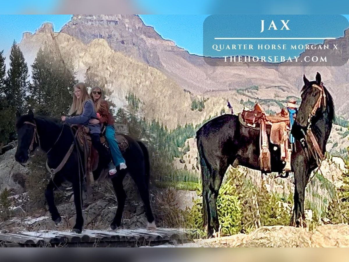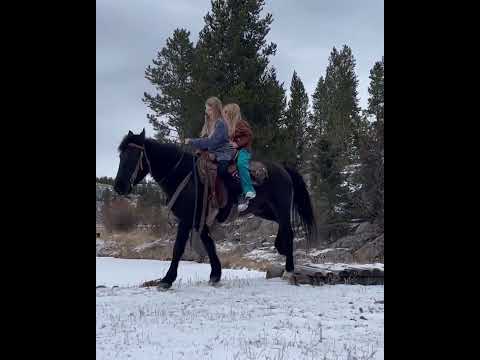 Jax is a 2018 model standing 14.1 hands, a striking black Morgan–Quarter Horse cross who has been a ranch favorite from the day we brought him home. He’s the kind of horse everyone in the family wants to ride. Jax has done the real work. He’s packed elk, bighorn sheep, mountain lions, and has safely carried little kids, grandmas, and everyone in between. Whether you need him to lead the pack string or ride anywhere within it, Jax handles the job with ease. This is a true family-safe horse. He’s gentle enough for beginners and children, yet still enjoyable for experienced riders. Jax naturally adjusts his energy to match his rider, helping inexperienced riders feel comfortable and confident in the saddle. Out on the trail, Jax can really cover some country with a big, ground-covering walk. When needed, he’s just as happy to slow down and plod along. He’s been ridden extensively in extremely rough mountain terrain and is exceptionally sure-footed. We live in the heart of the Rocky Mountains, so when we say rough country, we mean it—down timber, shale slides, ice, mud, bogs, rivers, snow, steep terrain, bikes, dogs, and wildlife. Jax handles it all without hesitation and stays calm and dependable. He’s also fun to ride around the ranch or in the arena. Jax lopes nice correct circles, picks up his leads, has flying lead changes, and a good stop. He’s confident in town and handles traffic without issue. Jax has never offered to buck, bolt, or cause trouble. He’s easy to catch in the pasture and is a pleasure to shoe, saddle, bridle, and handle in every way. Absolutely no vices. Our family lives on a private ranch in Wyoming just outside Yellowstone National Park. We don’t just visit the mountains—we live and work here, making our living horseback. Our horses are exposed daily to wildlife, rough terrain, and real ranch conditions. We are not horse traders. Each year we only offer a select few of our best horses, and this year Jax is one of them. There will certainly be a few wet eyes when he leaves, but our horses always go on to great homes and lasting friendships. There’s no “gotcha” with Jax—if something isn’t mentioned here, it’s only because we forgot to write it down. Bid with confidence on this once-in-a-lifetime gelding.