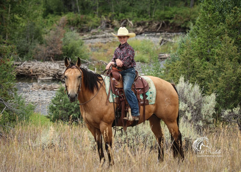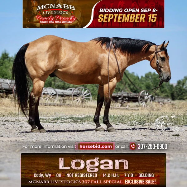 𝕄ℂℕ𝔸𝔹𝔹 𝕃𝕀𝕍𝔼𝕊𝕋𝕆ℂ𝕂's 🍂𝟑𝟎𝟕 𝐅𝐀𝐋𝐋 𝑺𝒑𝒆𝒄𝒊𝒂𝒍🍂 Happening now thru MONDAY | SEPTEMBER 15th - Available EXCLUSIVELY on HorseBid's website! For more details and to register visit: www.Horsebid.com CONSIGNOR CONTACT: McNabb Livestock LLC 307-250-0900 LOCATION: Cody, Wy BREED: Quarter Horse REGISTERED: No COLOR: Buckskin HEIGHT: 14.2 AGE: 7 GENDER: Gelding Logan is that super sweet ranch gelding that anyone can get along with. He’s gentle, kind, easy to catch and enjoys being around you. We purchased him from a neighbor who was forced to retire from riding only due to her health. We purchased her last 3 horses and she didn’t want to sell, he was truly loved and he took such excellent care of her. This is the kind of horse that everyone is looking for, the one that no one wants to sell. We have had him in our program for the past 6 months and he has been exactly everything she loved. She had owned him for 3yrs. He’s solid and seasoned down the trail, no vices, no bad habits. Give him time off and just go have a fun ride. No nonsense. He has been ridden alone for miles up in the mountains, he’s just solid and dependable. He’s also happy to ride in a group, not buddy sour, gets along with all the other horses. Logan is truly a horse of a lifetime. Our kids ride him, we ride him, and we hand him out to guests, he’s the whole package. Logan has always had excellent care and handling. He has had a basic PPE, up to date on worming, dental and farrier. We welcome you to do your own PPE and to come to the ranch a to meet Logan. We also are glad to help arrange transportation. We will hold the horses at no charge for a reasonable amount of time to get hauling arranged. For more information call 307-250-0900. We have lot more great stories we are glad to tell you Logan.