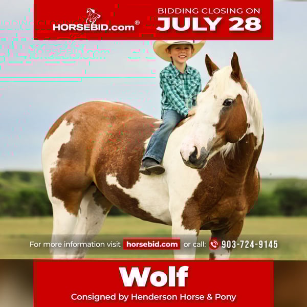 ⚔️ The HORSEMAN's Select ⚔️ Happening now thru MONDAY | JULY 28th - Available EXCLUSIVELY on HorseBid's website! For more details and to register visit: www.Horsebid.com CONSIGNOR CONTACT: Henderson Horse & Pony 903-724-9145 LOCATION: Slocum, TX BREED: Quarter Horse REGISTERED: No REGISTERED NAME: Wolf COLOR: Sorrel & White Paint HEIGHT: 14.2 AGE: 8 GENDER: Gelding Meet Wolf , an absolutely beautiful 8 year old sorrel and white paint gelding that stands at a perfect 14.2 hands tall who is fresh off of a 6,000 acre ranch in South Dakota! Wolf is the perfect size & demeanor for absolutely anybody…from the littlest of cowkids (2 years old to be exact, all the way up to their 82 year old grandpa) Wolf can be the main mount for anyone and everyone! Not everyday do you come across geldings like Wolf , he is one that has seen hundreds of days that started before the hot sun was even peeking over the horizon and worked an honest days work until it disappeared at sunset. He has seen days that were simple and easy and where he was just needing to be calm, cool, and trusty for his little cowboys & cowgirls. He has seen an array of different task and that is exactly why he is the horse he is today! True ranch horses are the most versatile horses you could ever ask for because they have seen a little bit of everything and can excel in many different disciplines due to them knowing how to handle new & different challenging task that are asked of them everyday. Whether it be cutting, reining, barrels, breakaway, team roping, or even putting them under english tack …. They can be taken from the everyday ranching grind and excel in any direction because they know how to handle themselves in new unknown situations and accomplish the goal that is set in front of them. To make Wolf even better, he is not just all brains either, this gelding has the absolute best demeanor on and off the ground! He is definitely what you would call the “in your pocket” type as he will be the first to meet you when calling him up from the 360 acre pasture the stay in and also allows you to instantly put his halter on and hop on for a ride to the barn! He also gets along easily in a herd and is a friendly friend to all who are around him. As see in the video, Wolf stands politely for the farrier and is also a perfect gentleman to bathe and groom. This gelding is so calm and is as honest as the day is long PLUS all the color you could ever ask for and allllllll the curves in alllllll the right places! Woooweeee if you look up the definition of the word “Handsome”, this guys picture is coming up, for sure! To add the cherry on top, he comes looking THIS good and doing it 100% sound and as cleaned legged as you can possibly find one! ♦️If Wolf sounds like what you have been looking for and he would be the perfect addition to your string and family, please feel free to call/text me, Taylor Henderson, (903) 724-9145, anytime for any questions you may have! I can help you arrange shipping with my shipper anywhere you need for a great rate and exceptional care! Or feel free to use a shipper that you already have in mind, either way, I will assist anyway I can to make this an easy and enjoyable experience. I look forward to hearing from you! -Taylor Henderson / Henderson Horse & Pony