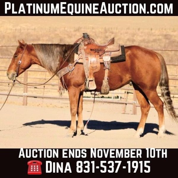 ONLINE AUCTION Place your bids at www.PlatinumEquineAuction.com Starting Bid $3500 Auction ends November 10th, 2024 Need a new saddle? Check out White Rock Saddles on our website or Facebook! Jeffry is truly a remarkable horse with his stunning silver mane and tail. At 6 years old, he stands at a sturdy 14.2 hands and has already proven himself on the ranch. He has been used for the past few months to gather strays, doctor sick cattle, and brand them – a true testament to his hardworking nature. Jeffry knows what it means to put in a long day’s work and he does so with ease. He has been started roping the lead steer and is a great roping prospect. Not only is Jeffry reliable when it comes to ranch chores, but he also possesses a gentle demeanor that makes him easy to handle by anyone. He is truly the kind of horse that everyone wants to take out for rides because you can always count on him to be safe and dependable. He is great on the trail goes where asked and is surefooted. He navigates all types of terrain with ease crosses water, logs and brush with confidence. In addition to being great on the ranch, Jeffry also excels in the arena. He picks up leads easily, has a smooth stop, and can turn around effortlessly. He goes with the flow and takes obstacles such as bridges or tires in stride without even flicking an ear. This well-rounded horse has even been ridden down busy streets without batting an eye. If you’re looking for a versatile horse who can do it all – from cattle, roping or just a nice trail partner Jeffry is the perfect horse for you. He tacks up easy handles time off well and is just a pleasure to be around he is one of the kindest horses. If you have been searching for the perfect partner to take you on endless trail rides or saddle up and go to work he’s ready and willing to do anything you ask of him with a clam and safe disposition. Jeffry is a friendly safe gelding who is a puppy to be around and even more fun to ride. He tacks up calm and will stand tied patiently. He loads well travels great and is good in a pasture or stall setting. I cannot say enough about how docile this boy is he is kind natured. Check out his video to see this amazing boy! Please contact Longhorn Ranch Dina 831-537-1915 Located in Paicines, CA. ONLINE AUCTION Place your bids at www.PlatinumEquineAuction.com Starting Bid $3500 Auction ends November 10th, 2024 Need a new saddle? Check out White Rock Saddles on our website or Facebook!