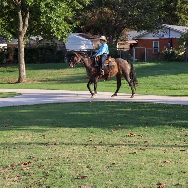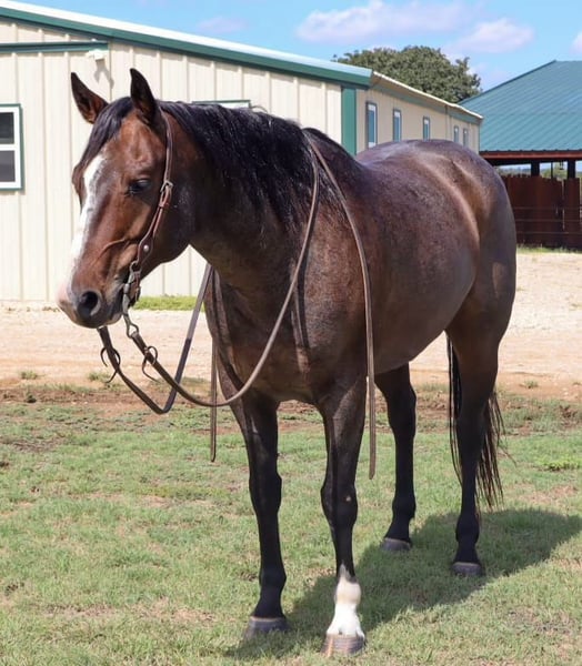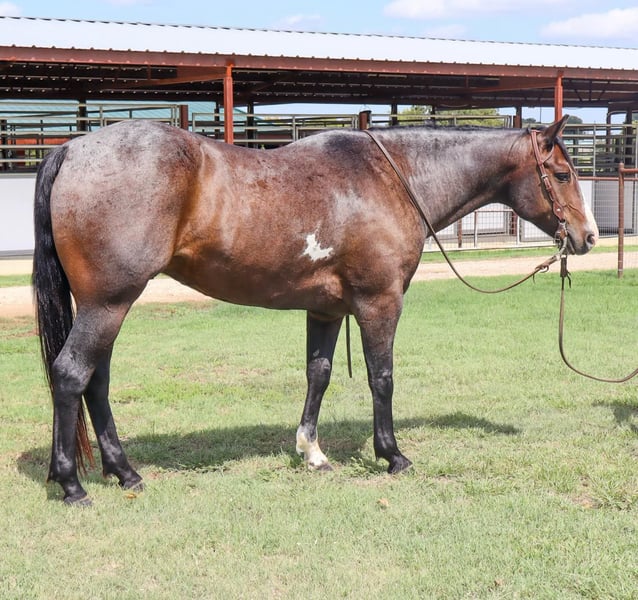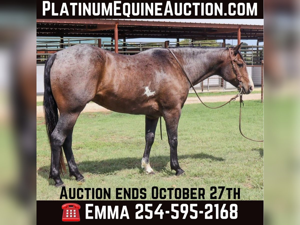 NLINE AUCTION Place your bids at www.PlatinumEquineAuction.com Starting Bid $3500 Auction ends October 27th, 2024 Need a new saddle? Check out White Rock Saddles on our website or Facebook! – a breath taking 2018 GRADE bay roan gelding. Trump stands 14.3 hands, is the definition of the American Ranch Horse- Raw boned, big brown eyed, bay roan, thick tailed, cowy, pleasure horse. Trump has been on a working ranch since day one! Trump is no stranger to long hours, rough country, and wild cattle. He is a what we like to call “handy”. He has a solid neck rein, travels correct, and always aims to please. Trump has been used in the sale barn aspect as well, where he is used to sort and load thousands of head every week. This stout boy has a vividly attractive stride and carries himself with ease. Trump has a big beautiful cross over in his turn arounds, packs his face pretty in his circles, and will get in the ground. He has never offered to buck or get cold backed with us. Trump has been introduced to the busy town and walks like a gentlemen on the trails, very confident when crosses water, down trees, steep mountains, and will never get hot or sour! He’s a very solid mount and we are so proud to offer such an exceptional gelding! He stands tied like a complete gentleman, easy to bridle and saddle, and loads/unloads himself. Trump is 100% sound and healthy! He’s been in good hands his whole life and his looks speak for themselves!! He has a Big hip and good clean legs! Don’t miss out on this opportunity, this is the perfect horse for anyone wanting a horse to put to work! For more info contact AA Ranch Emma 254-595-2168. ONLINE AUCTION Place your bids at www.PlatinumEquineAuction.com Starting Bid $3500 Auction ends October 27th, 2024 Need a new saddle? Check out White Rock Saddles on our website or Facebook!