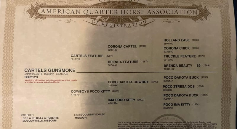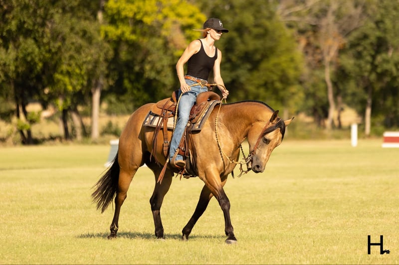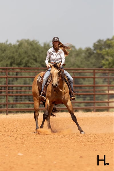 ONLINE AUCTION Place your bids at www.PlatinumEquineAuction.com Starting Bid $3500 Auction ends September 15th, 2024 Need a new saddle? Check out White Rock Saddles on our website or Facebook! Cartels Gunsmoke is a 6yr old, 14.3hh, AQHA registered gelding, “Kodak”, as he is affectionately known, is our little golden boy. Everywhere he’s gone he’s gotten compliments, not only his looks but his demeanor as well, and no matter the job you task him with he’s going to try his hardest to do and be the best; whether that’s doing work from sun up to sun down on the ranch, hitting the show pen in ranch versatility classes, packing toddler and youth riders around, or going for a trail ride. Kodak is no stranger to a hard days work and has been used in all aspects of ranch work. Most recent on his ranching resume, he was the main mount used on a 70,000 acre ranch in New Mexico where he gathered, sorted, doctored, branded, and loaded trucks. Where he was at in New Mexico is considered the high desert. If you’re unfamiliar with what the high desert entails, it is a vast and rocky environment which helped contribute to Kodak’s sure footedness. He will go all day for ranch work and has an extremely comfortable trot to set out at to check fence. Besides being used for ranch work outside, Kodak also has experience exploring state parks and trails where he will walk out on a loose rein alone or in a group and is a happy camper no matter how long or short of a trail ride you’d like to have. In the arena, Kodak is also a joy to ride. He’s smooth and fluid in all gaits and transitions and stays soft and supple in your hand. He has an easy turn around, can pick up both his leads from a walk, and will come right down to a slower gait or stop by a simple lift of your hand and some seat pressure. He’s easy to get along with in the saddle, has packed around inexperienced kids including our 3yr old son whom Kodak has been helping teach how to ride, and is a happy medium between “whoa” and “go” as he’ll go the pace that’s asked of him. Recently Kodak has dived into the show world of ranch versatility and has shown he has real potential to be a star in it with a few more shows under his belt. He does all maneuvers needed for trail (opening/closing gates, dragging logs, bridges, backing Ls, log jumps, water crossings, etc.), is pleasant in a cramped rail class, has a beautiful extended trot for your pleasure and ranch riding classes, has a solid foundation laid for the reining, and has a ton of natural cow sense for your cow work classes. He won’t be your open division winner, but Kodak is absolutely a mount a Non-Pro/Amateur/Youth could enjoy, show, and be successful with. On the ground, Kodak is as pleasant as a horse could get. He stands for absolutely everything like a gentleman, loves being doted on, is easy to catch, gets a long with others in a herd well, stalls with no issues, and is gentle enough that I have no second thoughts when it comes to my 3yr old son playing around Kodak or handling Kodak by himself. Kodak is UTD on all care from teeth to vet work and has a recent health exam on file including x-rays of his front feet and hocks with no remarkable findings. He requires no maintenance and has no bad habits or vices. Kodak has a personality as golden as the color of his coat and we absolutely love and adore him in every way. Being as phenomenal as he is at just 6yrs of age, the sky truly is the limit when it comes to the possibilities with this gelding. Whether you want a solid horse to use on your ranch, your next up and coming show horse, or a horse that the whole family can enjoy… Kodak can fill the position! H Spur Performance & Versatility Horses invites you to come meet Kodak in Weatherford, Tx and we can help assist setting up hauling nationwide. For any questions or to talk about if Kodak is the right fit for you, please contact Sarah at 817-366-6123. To watch all of Kodiak’s available videos in their entirety as well as view his health exam and additional pictures, please visit www.hspurhorses.com/cartelsgunsmoke ONLINE AUCTION Place your bids at www.PlatinumEquineAuction.com Starting Bid $3500 Auction ends September 15th, 2024 Need a new saddle? Check out White Rock Saddles on our website or Facebook!