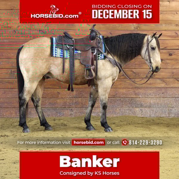 🎄𝐓𝐇𝐄 𝑯𝒐𝒍𝒊𝒅𝒂𝒚 𝐂𝐋𝐀𝐒𝐒𝐈𝐂🎄 Happening now thru MONDAY | DECEMBER 15th - Available EXCLUSIVELY on HorseBid's website! For more details and to register visit: www.Horsebid.com CONSIGNOR CONTACT: KS Horses 814-229-3290 LOCATION: Clarion, PA BREED: QH REGISTERED: No COLOR: Buckskin HEIGHT: 14.3 AGE: 7 GENDER: Gelding Banker is a 7 Year Old Super Good Looking Buckskin Quarter Horse Gelding. He stands 14.3 hands tall making him nice and easy to mount and dismount but Banker is also stocky enough to carry any size rider. Wow Check Him Out!! Who Doesn't Love a Buckskin ? In my opinion he is the best color God put on a horse. Banker is a good broke safe all around gelding. If your wanting a trail horse deluxe , arena horse or ranch horse Banker can do it all. He is great on the trails and rides out alone or with other horses. Good on the rough terrain and goes thru water with ease. Just watch his video and let him speak for himself. Great in the arena and has a nice walk, trot and canter. Carries the American Flag with ease . Nothing phases him or bothers him under saddle. He would also make a good ranch horse to take out and work and push the cattle around. Banker has lots of miles under his belt making him very seasoned and dependable! No tricks up his sleeve. Very Honest. Banker just had a full Health and Lameness Exam on 12-1-25 Which he passed with flying colors. You will like his one hand neck rein, good stop , back up and side pass. He is very well trained. Dont miss out on this super nice all around buckskin gelding. Feel free to Call or Text Kris anytime at 814-229-3290. We can also help arrange shipping anywhere in the United States.