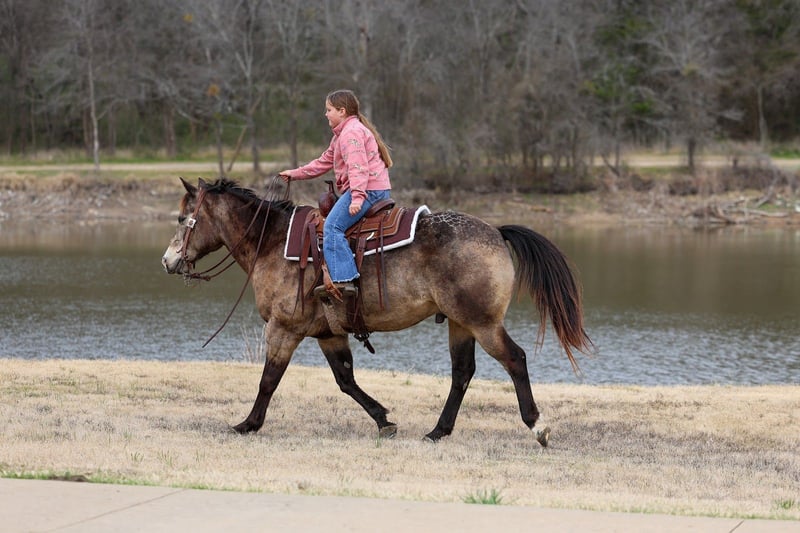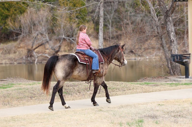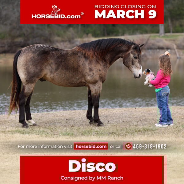 ℳ𝒶𝓇𝒸𝒽 ♦️𝐑𝐈𝐃𝐄𝐑'𝐒 𝐂𝐇𝐎𝐈𝐂𝐄♦️ Happening now thru MONDAY | MARCH 9th - Available EXCLUSIVELY on HorseBid's website! For more details and to register visit: www.Horsebid.com CONSIGNOR CONTACT: MM Ranch 469-318-1902 LOCATION: Forney, TX BREED: Quarter Horse REGISTERED: No REGISTERED NAME: Disco COLOR: Buckskin HEIGHT: 14.3 AGE: 8 GENDER: Gelding This is Disco as we call him. He is this most unique markings on his butt that looks like a disco ball. He is an absolute beautiful dark dappled buckskin gelding. In the summertime his dapples are huge. He is very pretty now but wait till summer. He gets even better looking. Disco is 8 years old and 14.3 hands tall. He is big thick boned, stout made little dude. And the perfect fun size. And yes just 8 yrs old!!! (Vet and horse dentist confirmed) He has his whole life ahead of him. Disco is a classy, well broke, and smart horse. We cannot express enough how great he has been for all riders that have rode him here. He simply makes Horse Riding FUN and EASY. He will do anything you ask him to do. From beginner to advanced. He has one of those willing to please type attitudes. He is always happy and ready to do whatever. He has been used on the ranch to check cattle, fences, rope and doctor sick calves. He is a tried and true solid ranch horse. With all the fancy buttons and that perfect little tiny slow lope he can step into from a stand still. He has a lot of cow sense and ability. He can go do anything you want him to do. And the best part is he super quiet and gentle. And stays that way year around. Throw the husband, the kids, or your non-horsey friend on him and know they will be safe and have a great ride!!!! After a long day at work you can go home and just enjoy riding him around the house. Or load him up and take him on a weekend camping trip through the trail or rough, rocky terrain, and camp out. He does perfect on overnight camping trips. He requires no prep, just load up and go! He crosses water, bridges, he has been around exotic animals. He will go out alone on trails too. Not at all barn soured or buddy soured. Absolutely nothing brothers this horse. He is as laid back as they come. Absolutely no buck. Don’t let this young amazing gelding get away from you if you are wanting something dependable that will last you a lifetime. We can and will help arrange affordable shipping anywhere. We will provide a new coggins when sold. He is up to date on all shots, feet, teeth, etc.. He is 100% ready for his new home. There will be a pic of a pre evaluation he had done by a vet. Just to show he is sound and healthy and has been checked out by a vet.