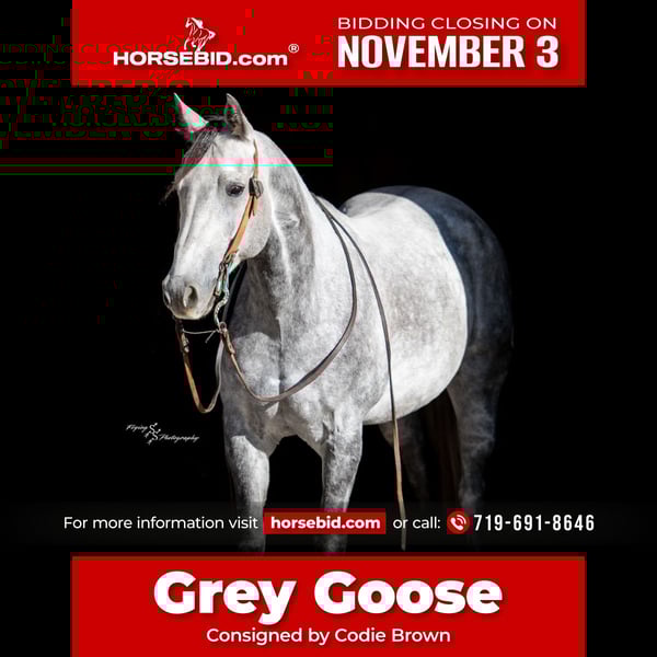 ⚜️𝐓𝐇𝐄 𝐅𝐀𝐋𝐋 𝐇𝐄𝐑𝐈𝐓𝐀𝐆𝐄 𝐂𝐋𝐀𝐒𝐒𝐈𝐂⚜️ Happening now thru MONDAY | NOVEMBER 3rd - Available EXCLUSIVELY on HorseBid's website! For more details and to register visit: www.Horsebid.com CONSIGNOR CONTACT: Codie Brown 719-691-8646 LOCATION: Hastings, MN BREED: Quarter Horse REGISTERED: No COLOR: Gray HEIGHT: 15 AGE: 8 GENDER: Gelding Grey Goose has been one of my personal horses for the last 5 years. He's has seen many days of wet saddle pads, working hard from sunup to sundown. He will make someone the perfect trail horse, riding on any terrain through any part of the country. He easily steps over downed timber, crosses creeks and ditches, and takes care of his rider. Goose has been exposed to all sorts of wildlife as well as small pets and livestock. He has also been used to lead pack mules, leading the string through trails or making his way through thick timber. Grey Goose would also work well for someone who is interested in showing in the ranch horse events. He will lope circles correctly, picking up his leads on cue. Side passes, soft one-handed neck rein, backs up, work a gate, has a nice turn around and stop. Goose even rides bareback! He can be ridden by anyone who can sit in the saddle and hold the reins. He has years of experience under saddle, and his ride is a shining example of that. Goose is easy to catch, gets along well with pasture mates when turned out, and also does well stalled. He is easy to bathe and shoe. Currently, he is barefoot, but he also does fine with shoes. If you have any questions or would like to meet Grey Goose prior to the auction ending please contact me at, 719-691-8646.