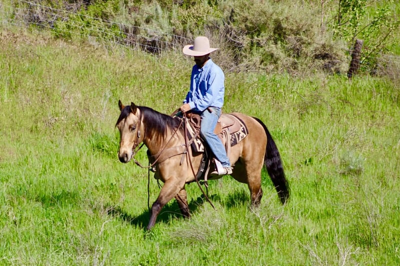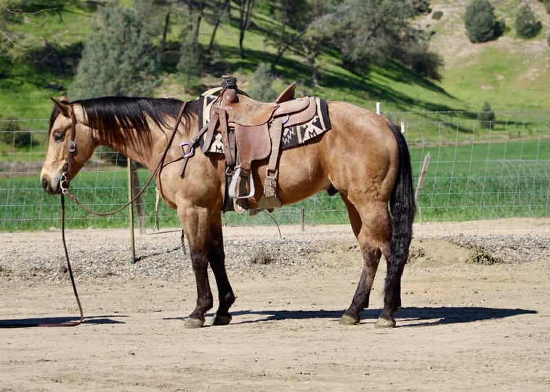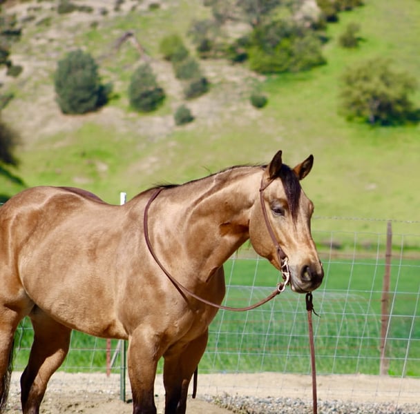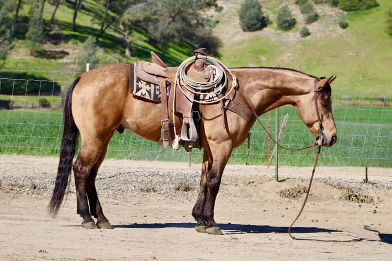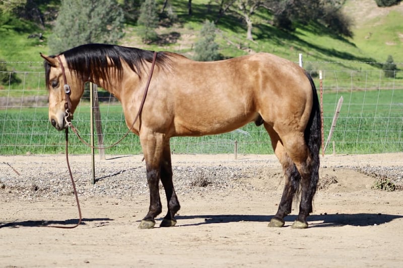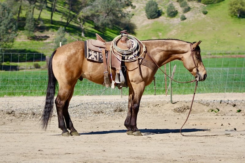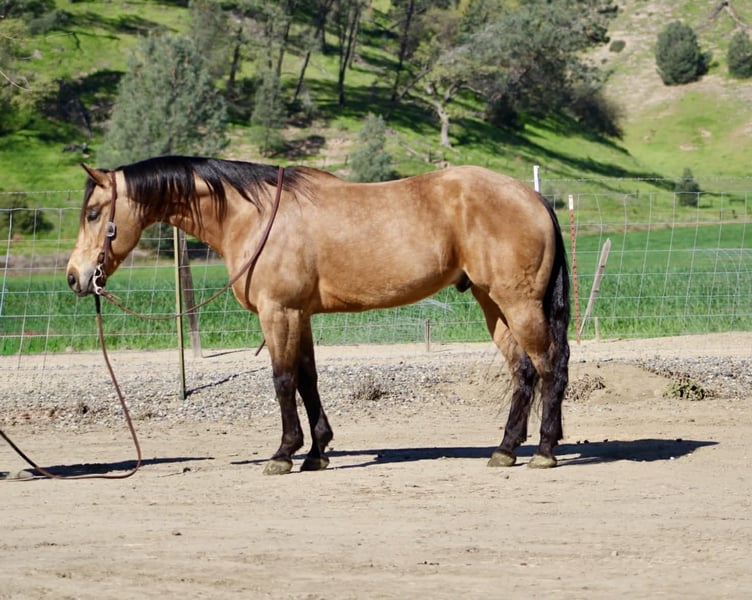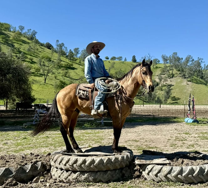 "AVAILABLE ON ONLINE HORSE AUCTION AT www DOT PlatinumEquineAuction DOT com BIDDING OPEN NOW thru SUNDAY | MARCH 22ND! *Final price will be determined on auction site* CONSIGNOR CONTACT INFO: Longhorn Ranch 831-537-1915 LOCATION: Paicines, CA AJ Golden Dapple Buckskin Gelding • 8 Years Old • 15 Hands If you’ve been waiting for a calm golden buckskin that anyone can ride, your search might just be over. Meet AJ. This golden dapple buckskin shines like polished gold in the sunlight, dapples glowing from every angle. But what truly makes AJ special isn’t just his color — it’s his mind. AJ is calm, steady, and completely unflappable. The kind of horse that settles into whatever you ask of him and makes every ride enjoyable. Riders of all levels feel comfortable on him, from beginners learning the ropes to seasoned riders wanting a dependable partner. He has been exposed to just about everything you can think of. Flags flying, tires dragging, pool noodles waving, tarps, bridges, tight spaces and obstacles — AJ handles it all with quiet confidence and a level head. AJ is also comfortable riding through town. Pedestrians, barking dogs, honking cars, passing traffic, big trucks, and rumbling semis are all taken in stride. He stays calm and focused on his rider no matter what is happening around him. On the ranch he’s a willing partner that will gather, sort, and cover country with ease. He reads cattle naturally and goes about his job with a practical ranch-horse mindset. AJ has also been started on the lead steer and is showing great potential to become a rope horse. He tracks cattle well and is picking up the job with a willing attitude. Out on the trail, AJ is exactly what most riders are searching for. He is sure-footed, confident, and enjoyable whether riding alone or in a group. Creeks, brush, uneven ground, and open country are all just part of the ride for him. In the arena he rides soft and balanced with smooth circles, a nice stop, and an easy turnaround. He stays honest and enjoyable whether you ride him every day or give him a few days off. Around the barn AJ is just as pleasant. He ties quietly, hauls well, stands patiently for the farrier, and settles easily in a stall or turnout. AJ is the type of horse the whole family can enjoy, while still being useful enough for ranch work, trail adventures, obstacles, or progressing further in the roping pen. And when that golden coat catches the sunlight… he absolutely glows. Good-minded horses with AJ’s looks, versatility, and disposition are getting harder and harder to find. Don’t miss the opportunity to make him yours. Longhorn Ranch – Paicines, California Call or Text Dina: 831-537-1915 Nationwide shipping available. We are happy to coordinate reliable transportation anywhere in the United States.