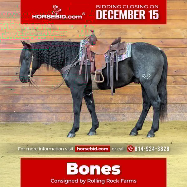 🎄𝐓𝐇𝐄 𝑯𝒐𝒍𝒊𝒅𝒂𝒚 𝐂𝐋𝐀𝐒𝐒𝐈𝐂🎄 Happening now thru MONDAY | DECEMBER 15th - Available EXCLUSIVELY on HorseBid's website! For more details and to register visit: www.Horsebid.com CONSIGNOR CONTACT: Rolling Rock Farms 814-924-3828 LOCATION: Miola, Pa BREED: Quarter Horse REGISTERED: Yes REGISTERED NAME: WHIPP HANCOCK BURKE COLOR: Blue Roan HEIGHT: 15 AGE: 7 GENDER: Gelding Bones is a registered Quarter Horse gelding who is as attractive as they come. He has a strong and sturdy build with an eye catching presence and a long full mane and tail that make him stand out anywhere he goes. At fifteen hands tall he is a comfortable size for most riders and easy to sit on and handle. He is seven years old and in the prime of his life. Bones is well broke and enjoyable to ride. He neck reins correctly and moves off leg pressure willingly. He will side pass, ride around nicely in the arena, and carry himself with a steady head whether you want him collected or relaxed with a level head. He has a smooth easy lope and will one step lope on the correct lead each way. He is the type of horse that feels reliable and consistent every time you swing a leg over him. He has been ridden outside a lot and handles new places with a calm mind. He goes through water, steps over brush and logs, and stays steady even with activity going on around him. He has been around dogs, chickens, goats, and farm traffic and stays quiet. He has also been used around cattle and does well when asked to sort or move them. Bones is easy to have in the barn or out in the pasture. He is simple and easy to catch, good to handle, and fits well in a group of horses. He recently had a complete health and soundness exam on 12/1/2025. He also sells with a current negative Coggins, recent deworming, and a rabies vaccine. Bones is the rare combination of young, well trained, gentle, and uncomplicated. He has the foundation, talent, and mind to go in any direction whether you want a reliable family horse, a performance prospect, a steady trail partner, or a versatile all around gelding with a truly exceptional temperament. He is the kind of horse that makes every day enjoyable and he has his entire future ahead of him. If you would like to check out Bones or have any questions please feel free to contact Ethan at (814) 924-3828