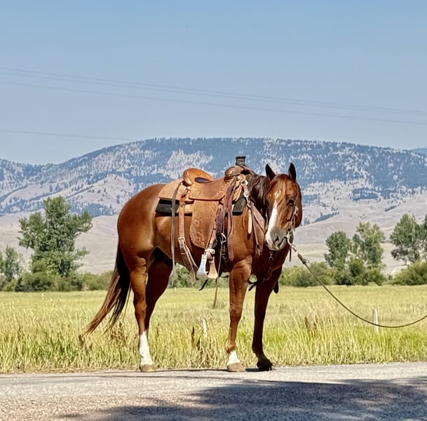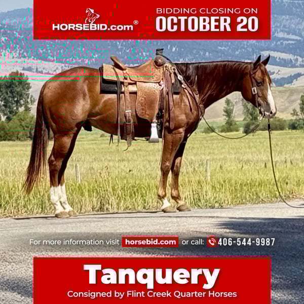 ♦️ 𝐭𝐡𝐞 𝐀𝐌𝐄𝐑𝐈𝐂𝐀𝐍 𝓕𝓪𝓵𝓵 𝓒𝓵𝓪𝓼𝓼𝓲𝓬 ♦️ Happening now thru MONDAY | OCTOBER 20th - Available EXCLUSIVELY on HorseBid's website! For more details and to register visit: www.Horsebid.com CONSIGNOR CONTACT: Flint Creek Quarter Horses 406-544-99987 LOCATION: Drummond MT BREED: Quarter Horse REGISTERED: No REGISTERED NAME: Tanquery COLOR: Sorrel HEIGHT: 15 AGE: 7 GENDER: Gelding Tanquery is a sorrel seven-year-old grade gelding that stands 15 hands tall. He is out of a Tanquery Gin bred stud, and a good cow horse mare that was not registered so he sells grade. This guy is a really nice ranch and trail horse that is very gentle and has a great handle on him. He is a fast walking, confident guy that is fun to go do any job on. He has drug calves to the branding fire and has roped and doctored lots of cattle in the pasture. He is really good too sort cattle on and will get down and dirty with a cow. He has a good one hand neck rein and operates really well. He will lope nice circles in the arena and has a big stop. Turns around both directions and will easily step to his correct leads. He would make a great team penning or sorting horse and would finish into a team roping horse easily. This guy is fun to take to the mountains to trail ride or gather cows on as he is a fast walker and will keep those bridle reins swinging. This is the kind of horse that I really enjoy riding. He is really good minded and tries hard to be a good willing partner with you. He crosses water and the other obstacles easily and has no bad habits. Good too shoe and haul and loves to get a bath when he’s done working for the day. He has never offered to buck or be silly with us and is the kind you can lay off until you need him and he will saddle up the same. He is trained to let you climb up on a stump or step and simply smooch to him and he will side pass over and make it easy to get on. He is a really nice using Horse that has class and eye appeal with a long mane that hangs to the bottom of his neck. this is a solid individual that is the perfect age. If you are in need of one like this, feel free to give us a call and come and try him at the ranch to see if it’s a good fit for you. Please call and we will tell you everything we know about this good gelding. call or text Tom at 406-544-9987.